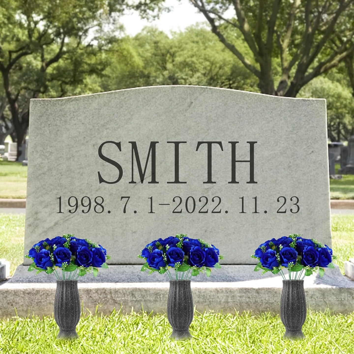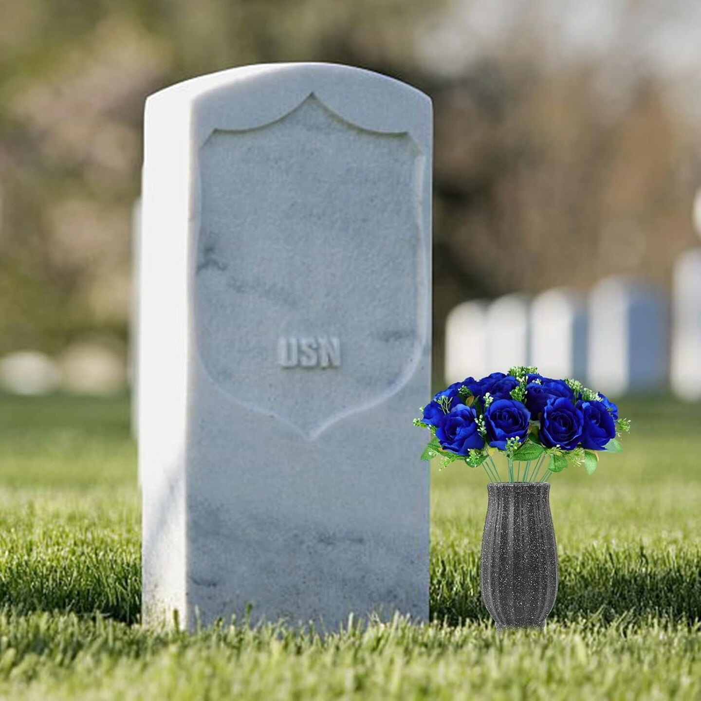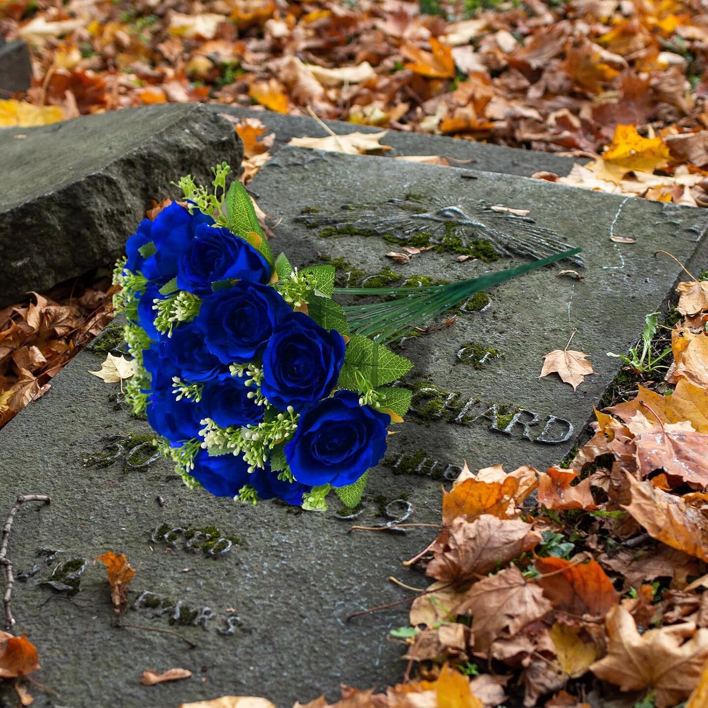 Artificial Cemetery & Memorial Flowers – Blue Silk Rose Gravesite Bouquet, 18-Head Outdoor Grave Decoration for Headstones and Memorials