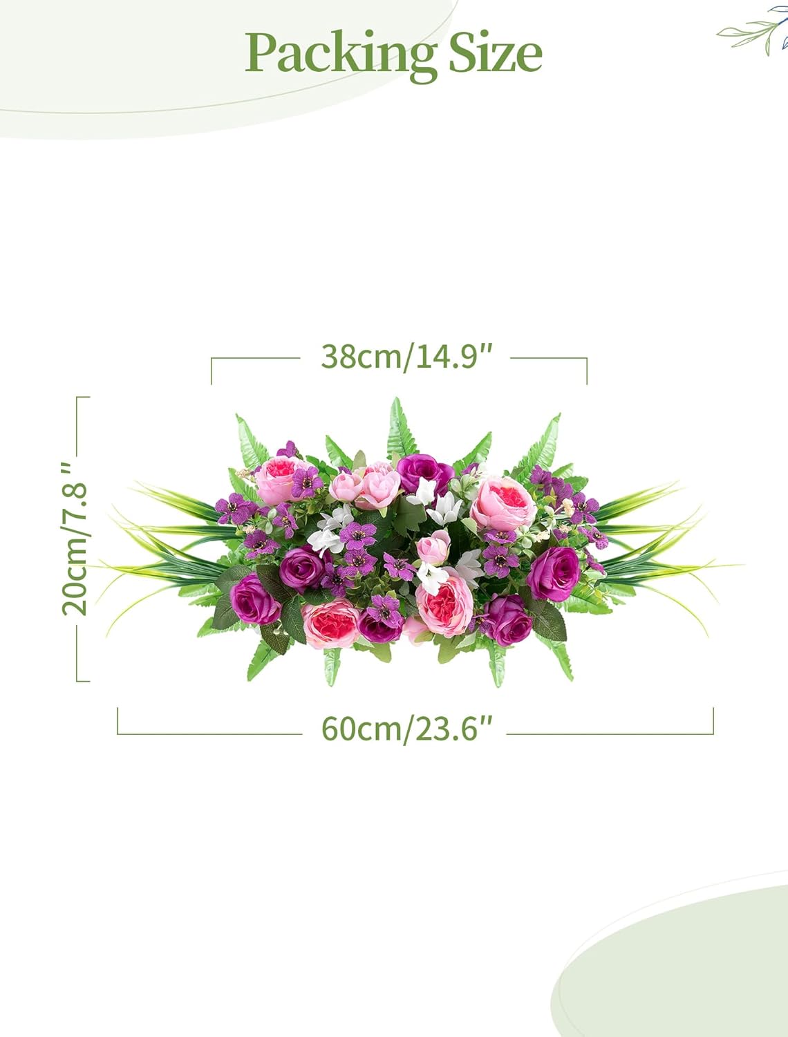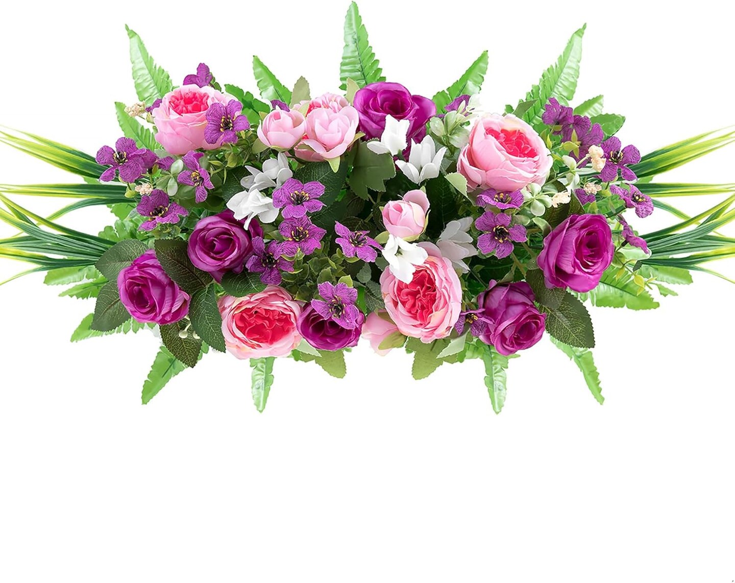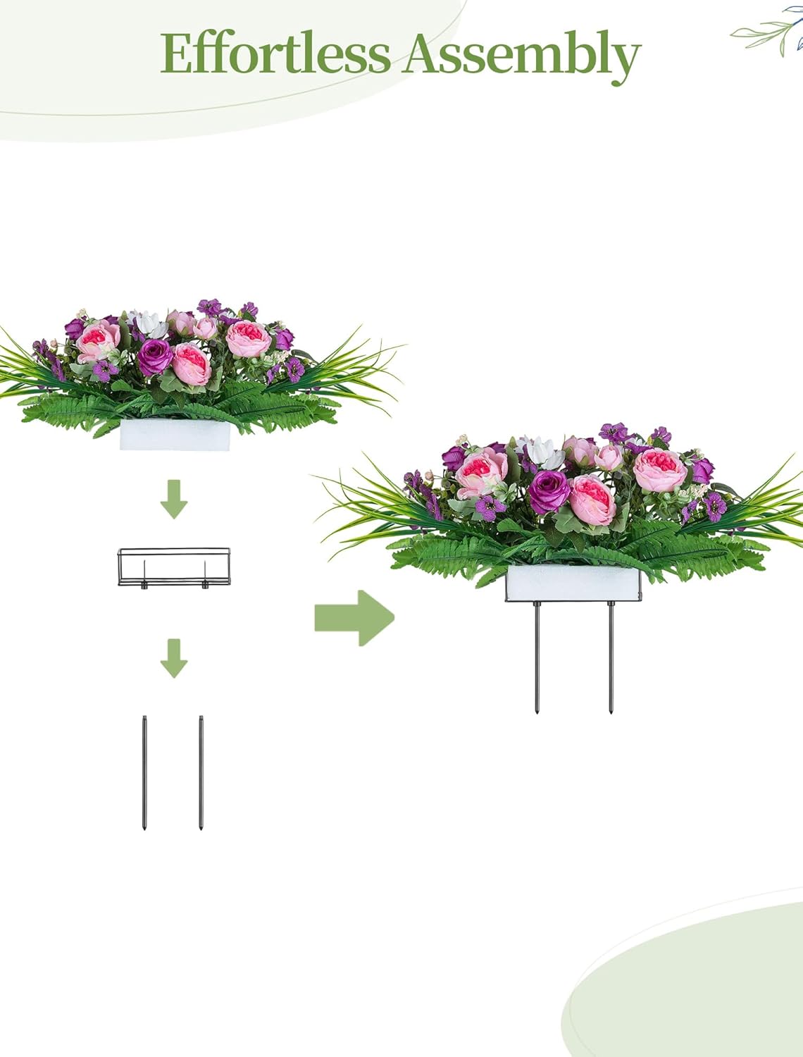 Artificial Cemetery & Memorial Flowers with Stake – Purple Roses & Pink Peonies Gravesite Bouquet, Outdoor Headstone Decoration, Weather-Resistant Memorial Arrangement (1 Piece)
