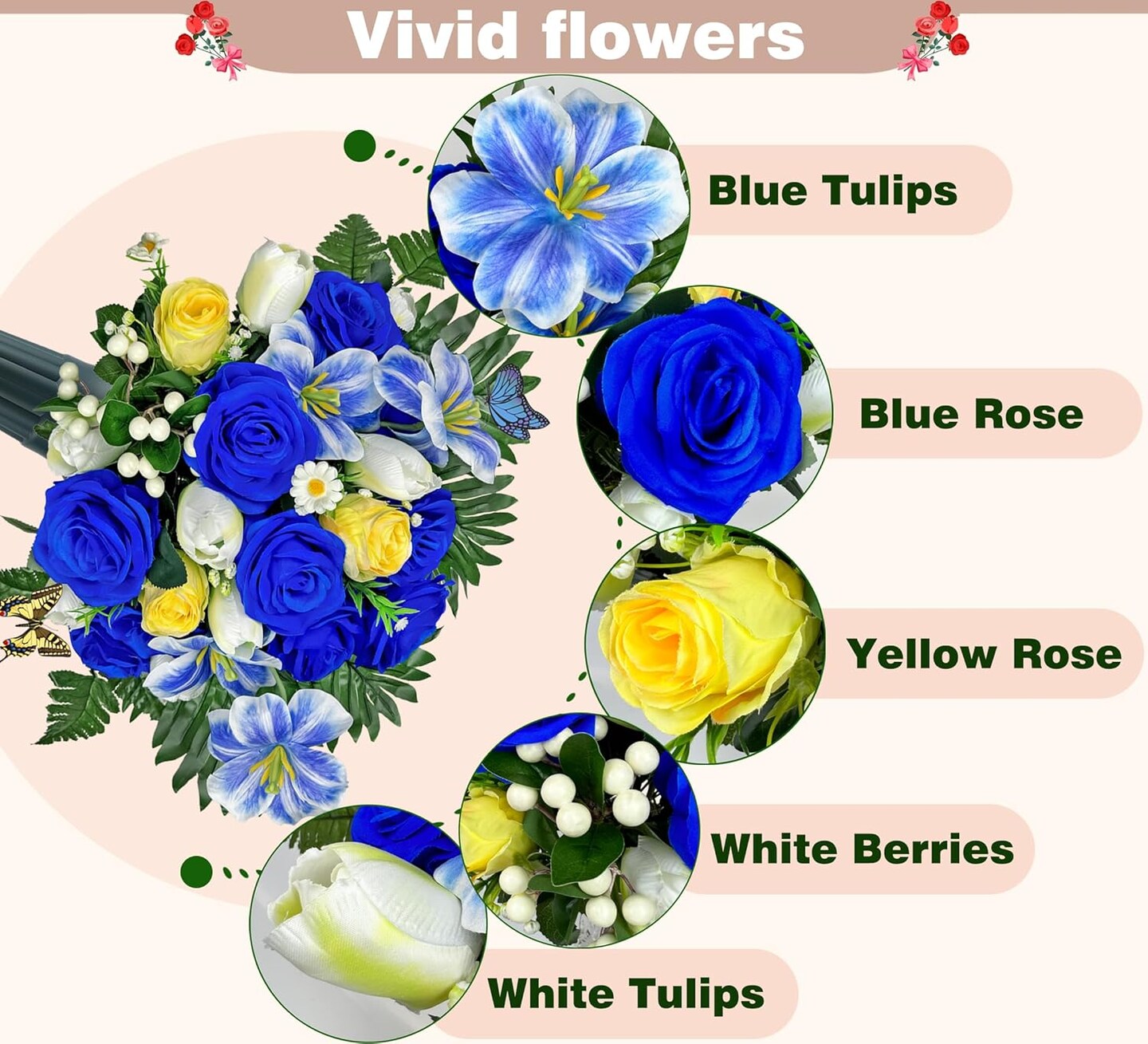 Artificial Cemetery & Memorial Flowers with Vase – Blue Silk Rose & Tulip Gravesite Bouquet, Outdoor Headstone Decoration, Weather-Resistant Memorial Arrangement