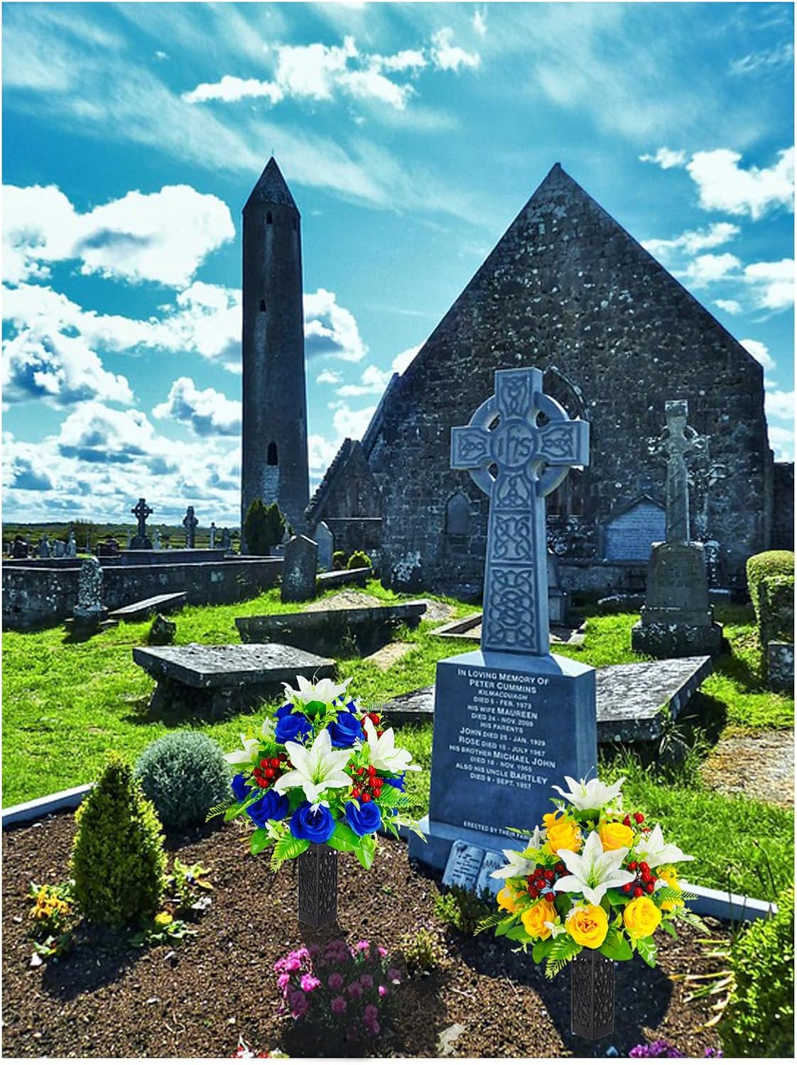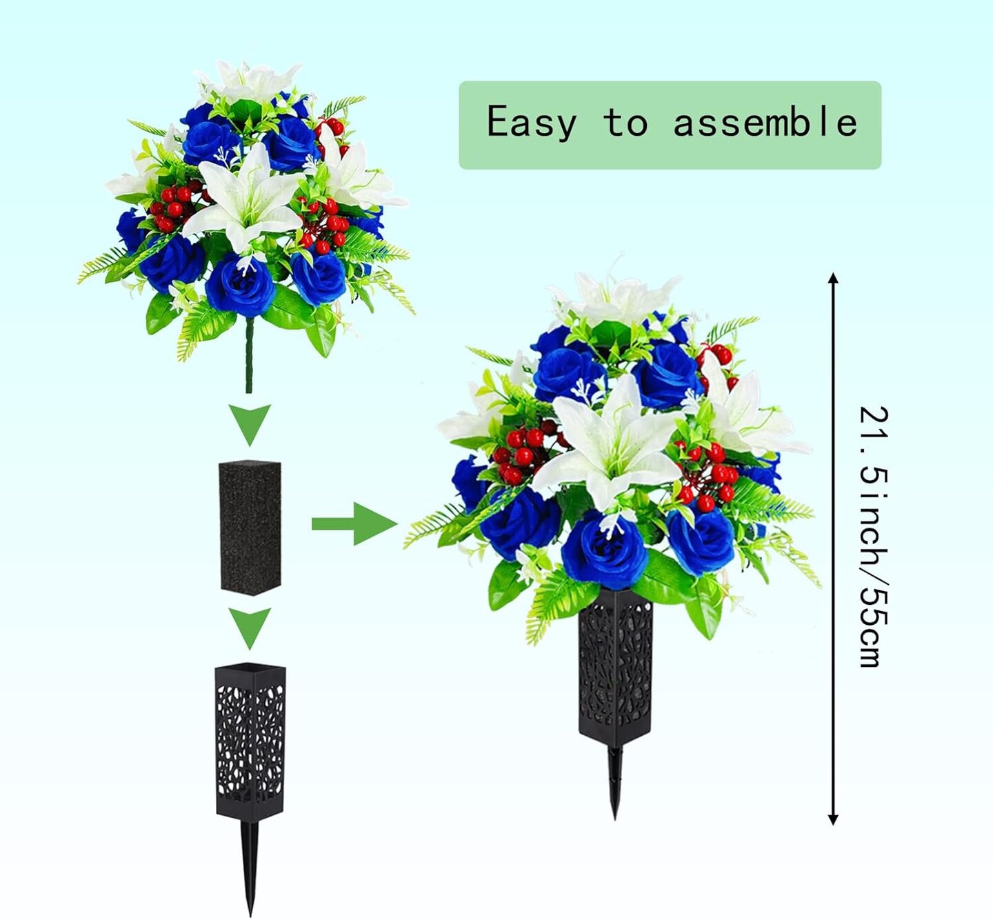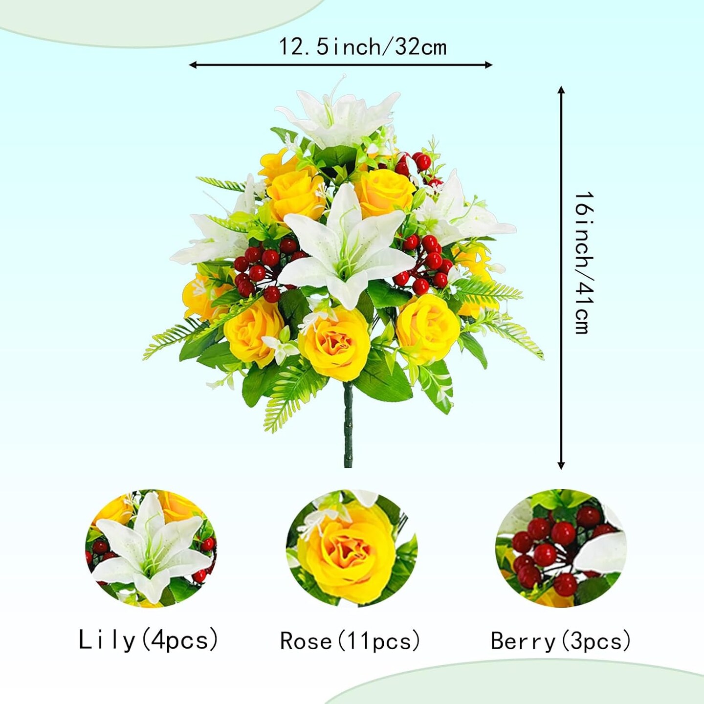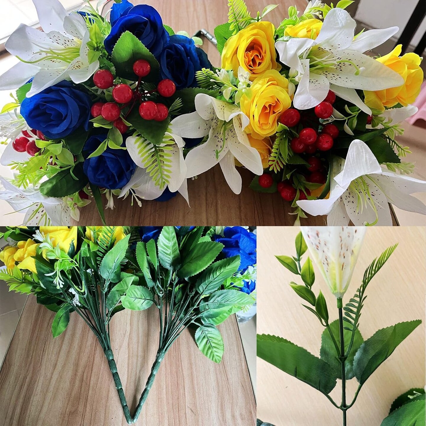 Artificial Cemetery & Memorial Flowers with Vase – Blue & Yellow Silk Rose and Lily Gravesite Bouquet, Outdoor Headstone Decoration, Long-Lasting Memorial Arrangement (2 Sets)