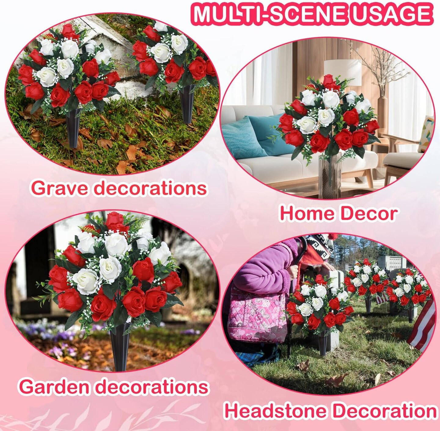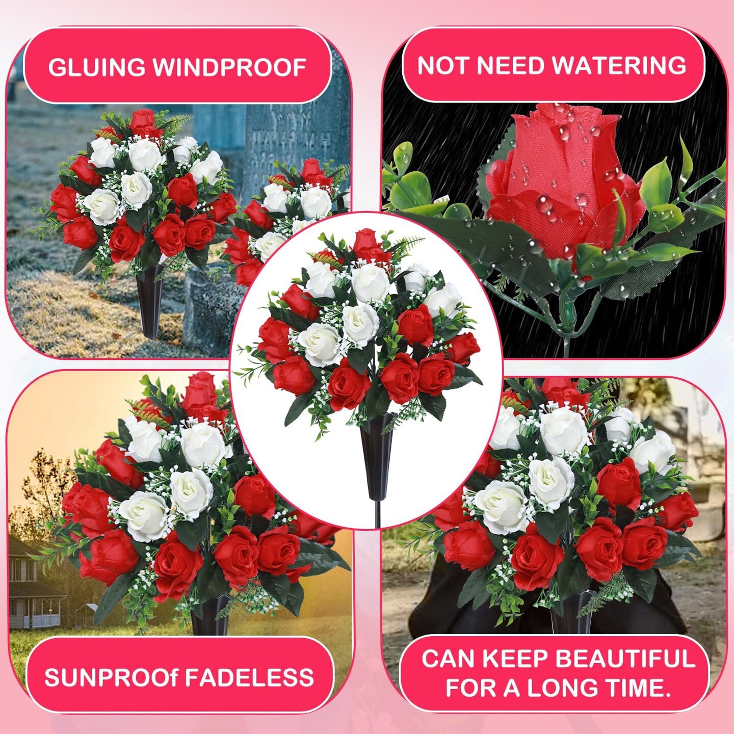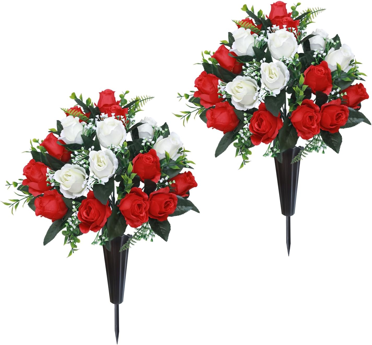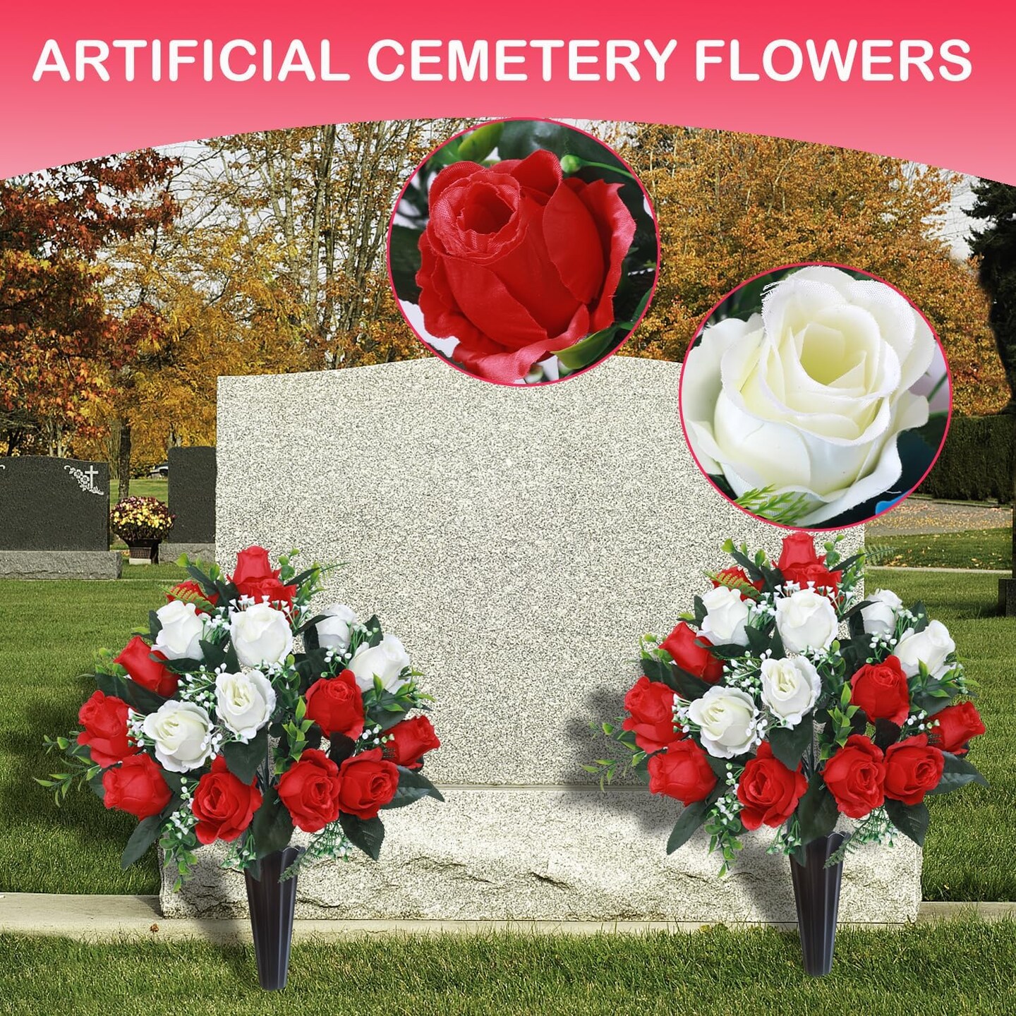 Artificial Cemetery & Memorial Flowers with Vase – Red & White Silk Rose Gravesite Bouquet, Outdoor Headstone Decoration, Long-Lasting Memorial Arrangement (2 Sets)