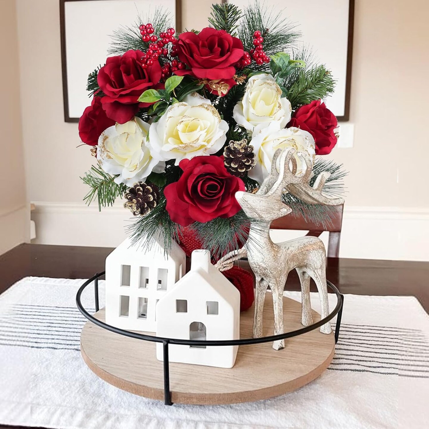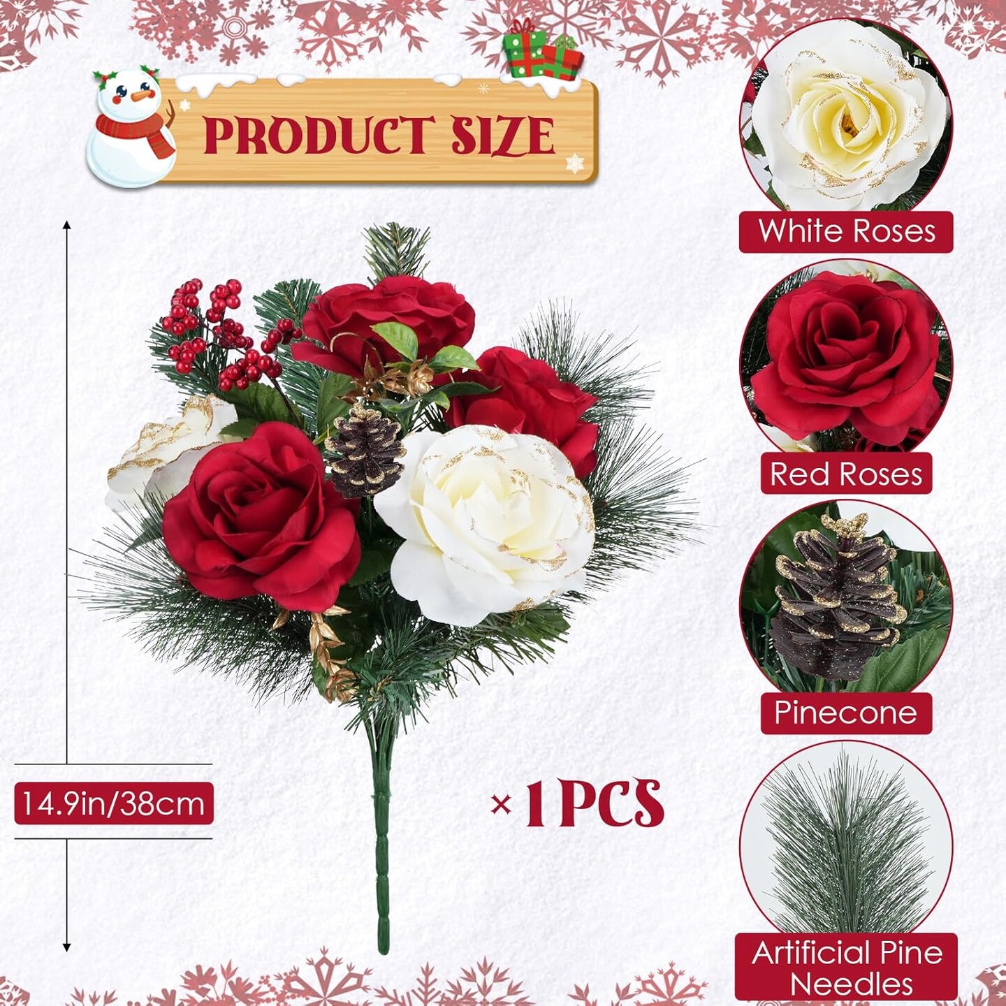 Artificial Christmas Flowers Faux Rose Bouquets Red Rose with Berries Winter Flower Arrangements Cemetery Flowers for Home Table Centerpieces Indoor Outdoor Xmas Holiday Party