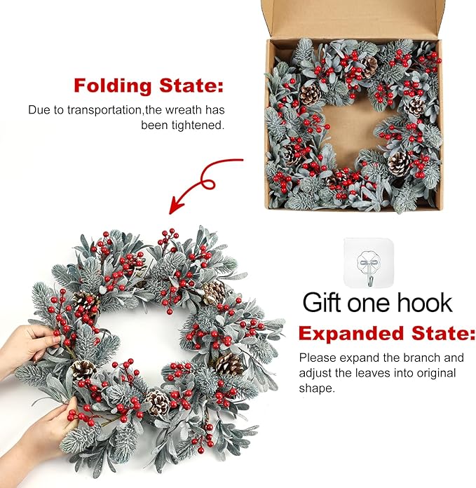 Artificial Christmas Wreath 20 Inch Christmas Wreaths for Front Door Winter Wreath with Red Holly Berries Pine Cones for Front Doors Xmas Winter Holiday Indoor and Outdoor