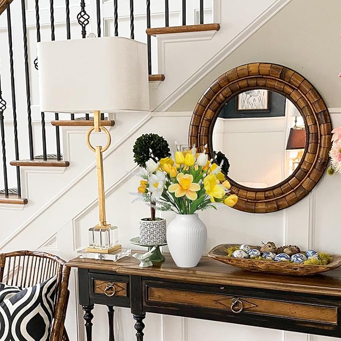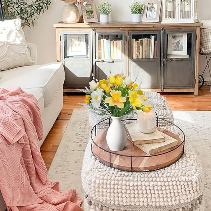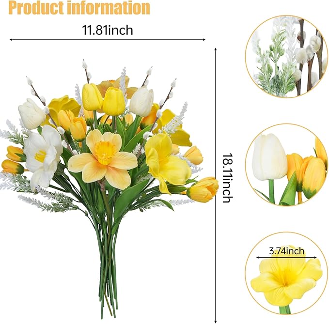 Artificial Easter Flower Fake Daffodils Flowers Yellow Tuilp with Pussy Willow Silk Spring Flowers 18IN Floral Arrangament for Indoor Kitchen Home Table Centerpieces Wedding Cemetry Decor