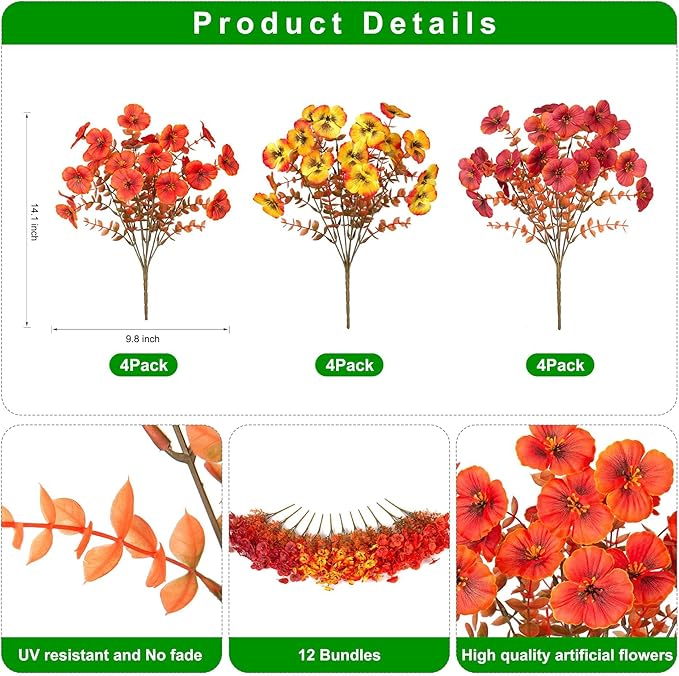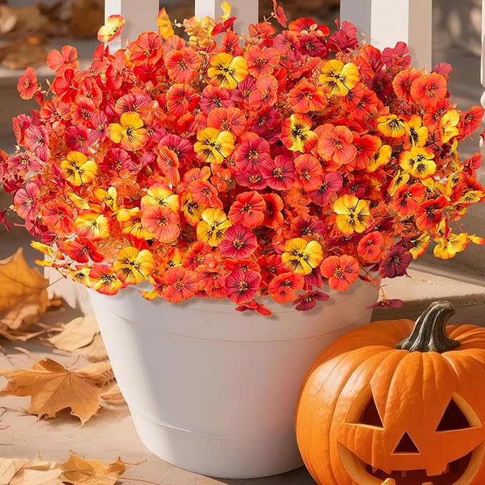 Artificial Fall Flowers for Outdoors Decoration, 12 Bundles Faux Pansies Fake Mums Flower Plants UV Resistant No Fade, Realistic Silk Pansy for Porch Planters Garden Patio Yard (Red Orange Yellow)