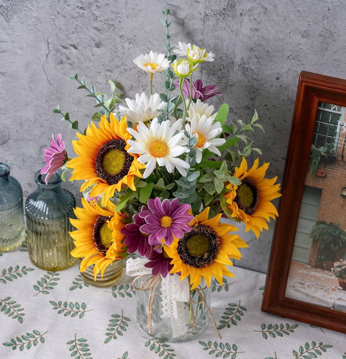 Artificial Faux Flowers in Vase for Home, Fake Flowers Arrangment with Pot, Sunflower Silk Daisy Bouquet for Fall Spring Decor Coffee Table Dinning Room Kitchen Centerpiece Table Decorations