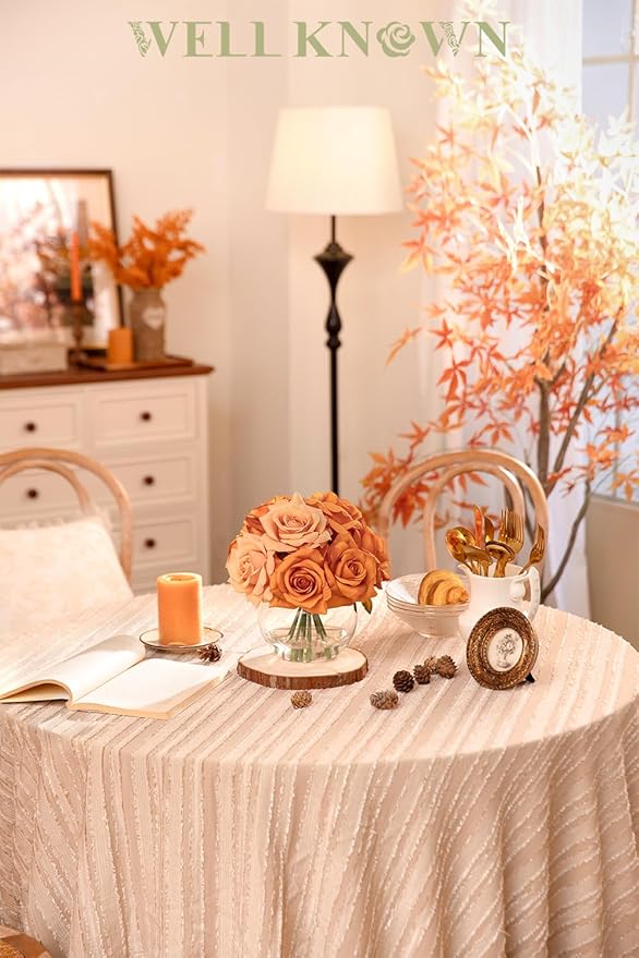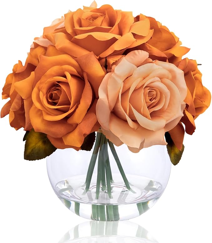 Artificial Flowers Arrangements in Vase with Faux Water, Artificial Orange Champagne Silk Rose Bouquet with Vase for Winter Spring Seasonal Home Wedding Party Centerpieces Decor & Mom's Gift