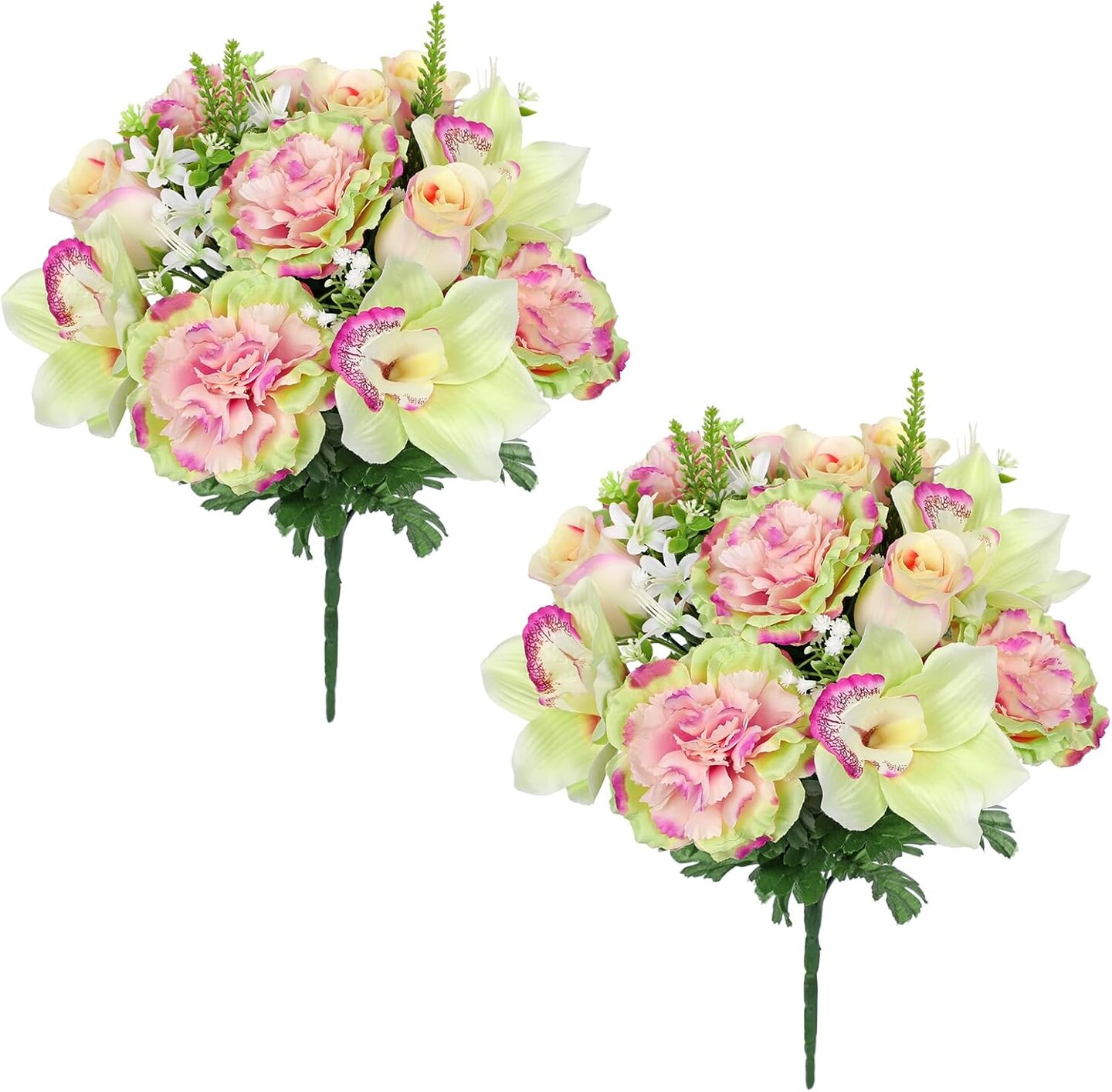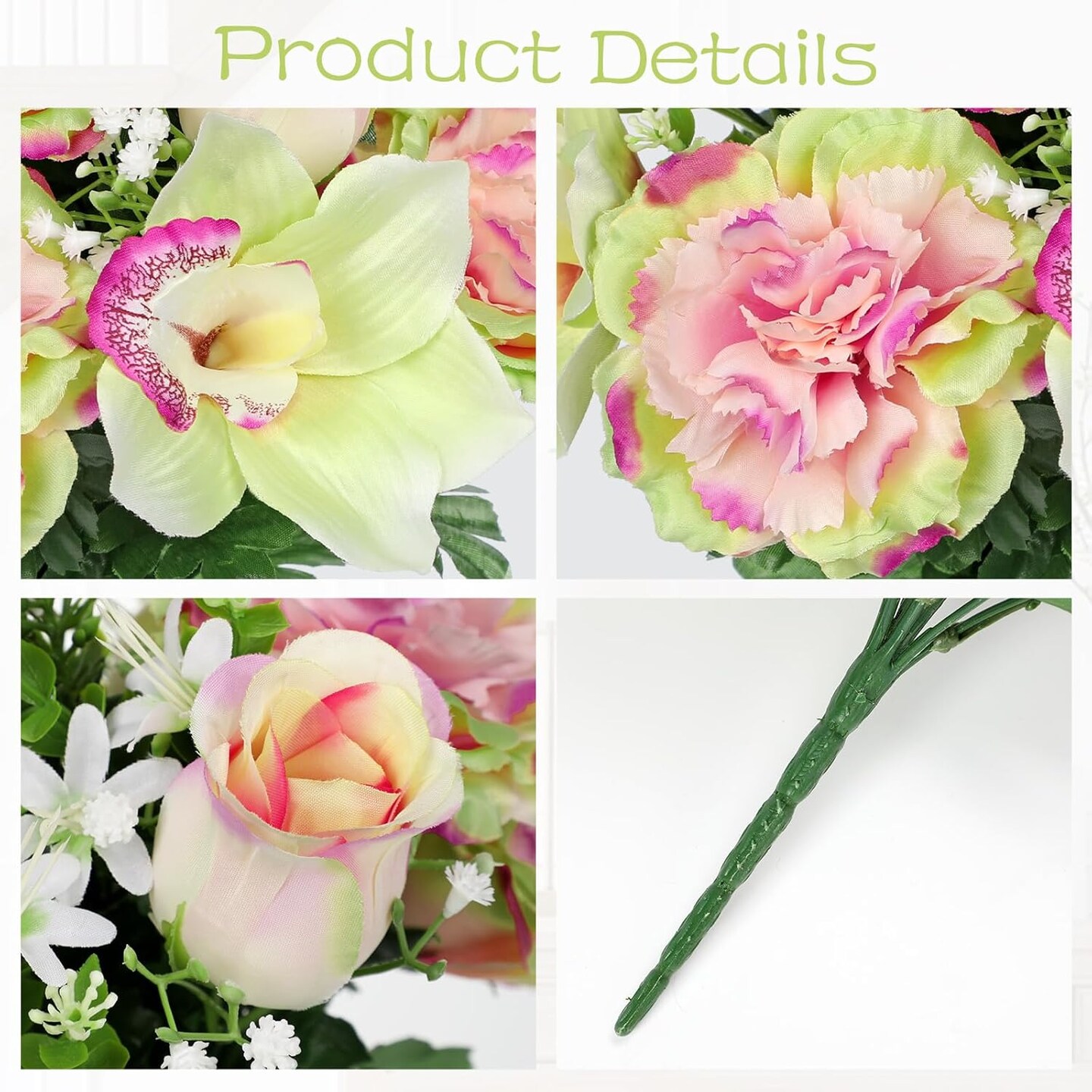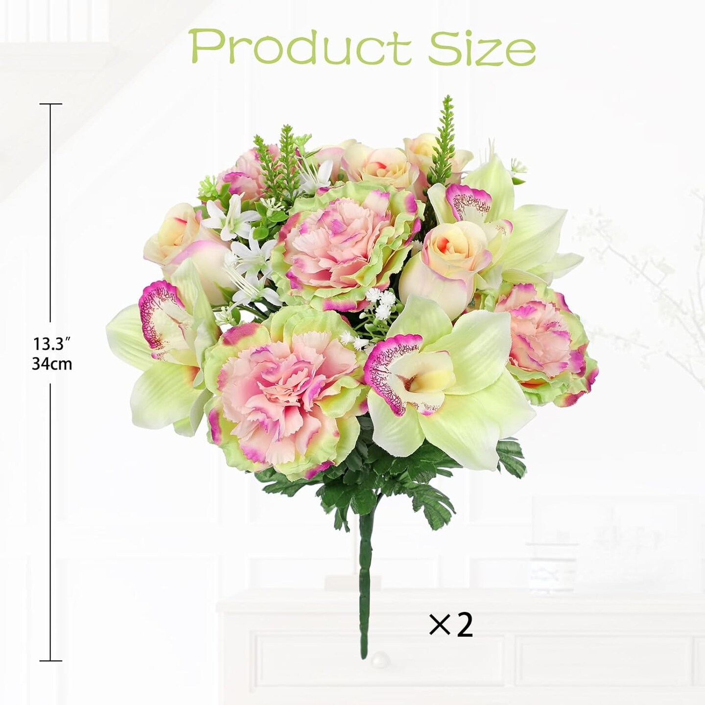 Artificial Flowers Bouquet – 2 Pack Faux Silk Roses, Carnations & Orchids, Mixed Floral Arrangement for Home, Office, Memorial, and Cemetery Decoration