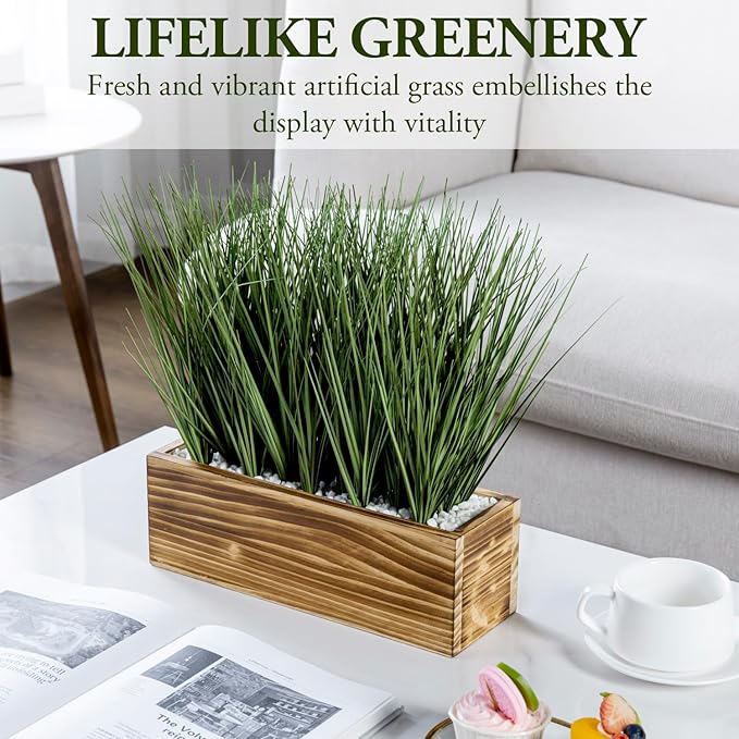Artificial Grass Plants in Rustic Burnt Solid Wood Planter Box, 12 Inch Decorative Wooden Container with Faux Greenery Plant, Indoor Table Decor