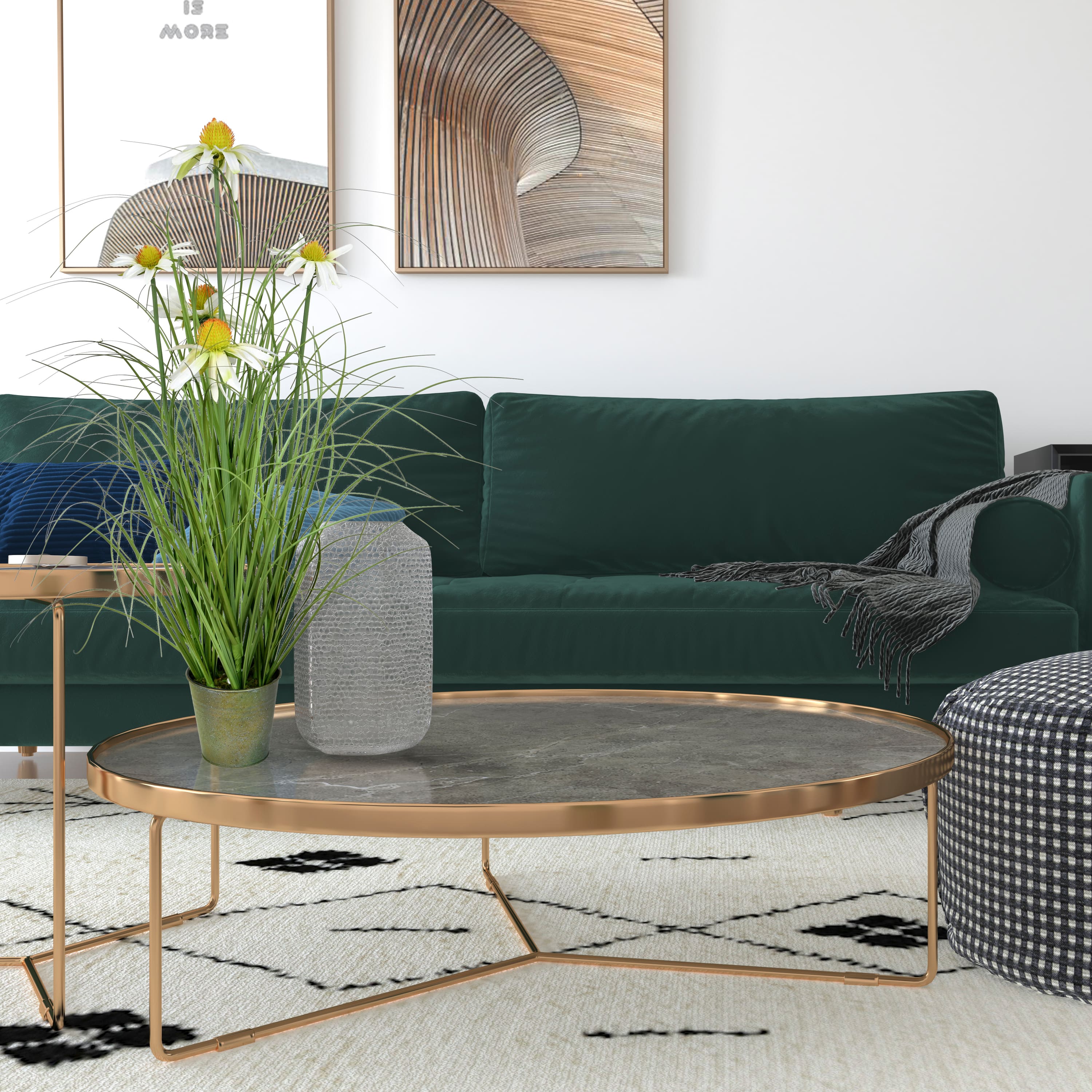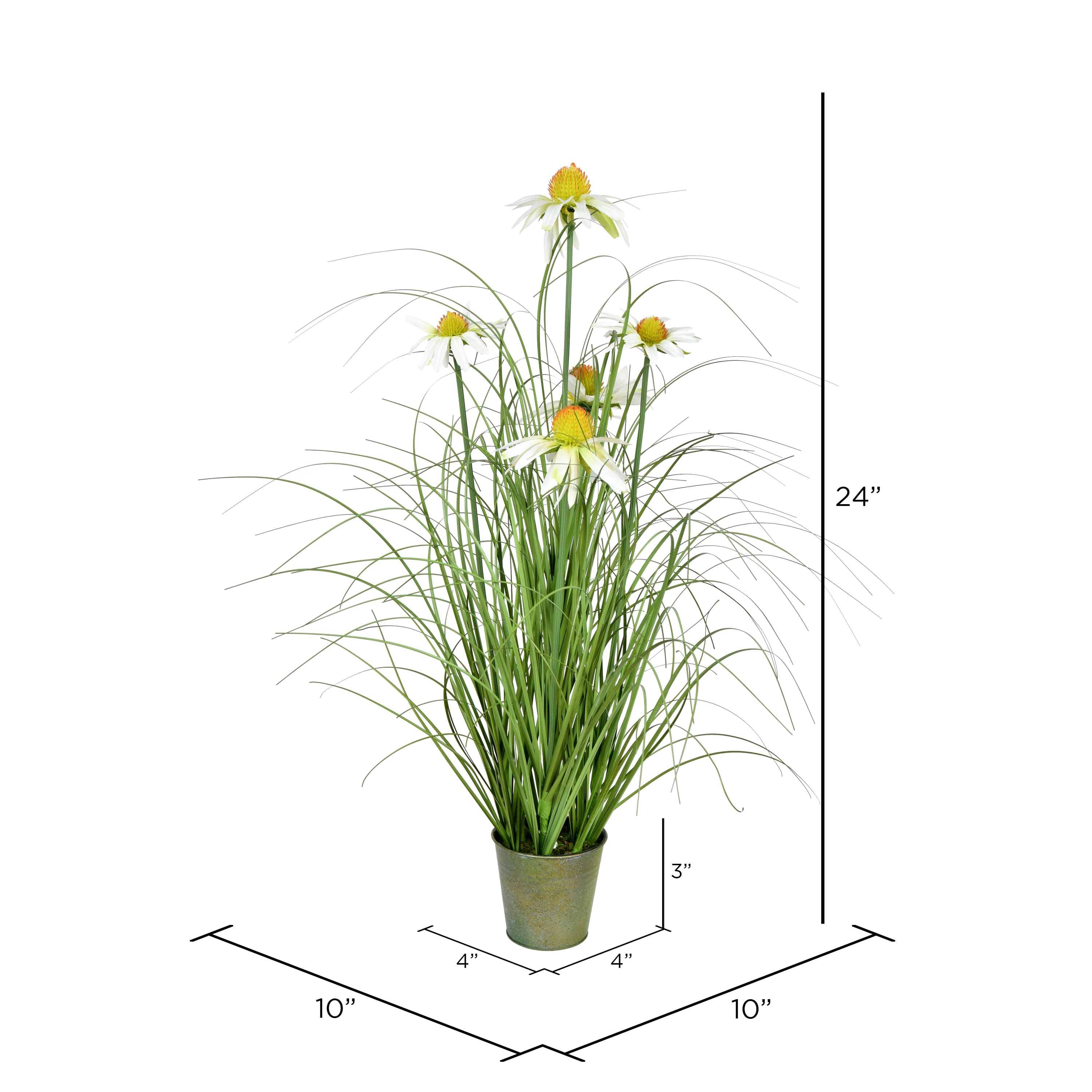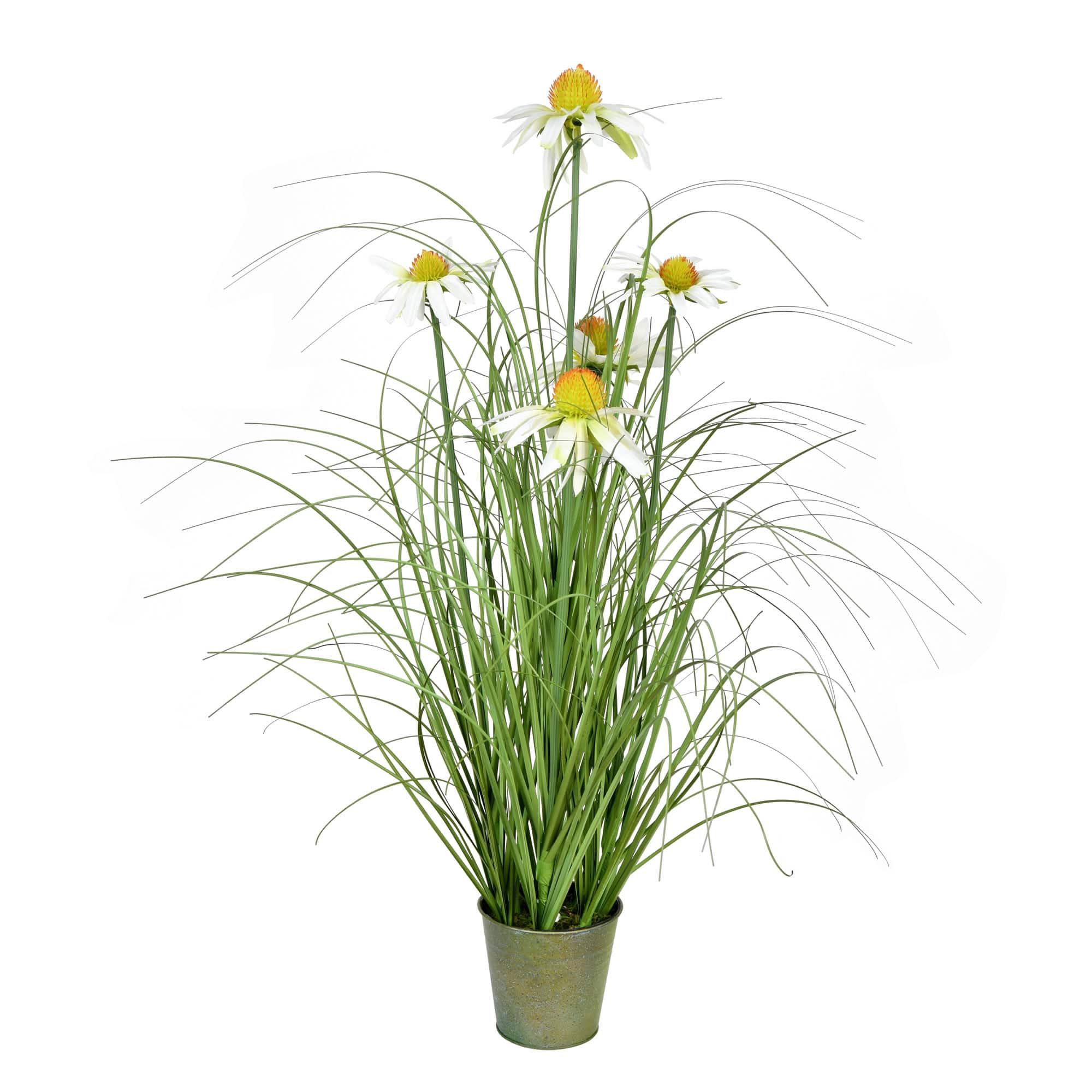 Artificial Green Grass & Daisies in Iron Pot