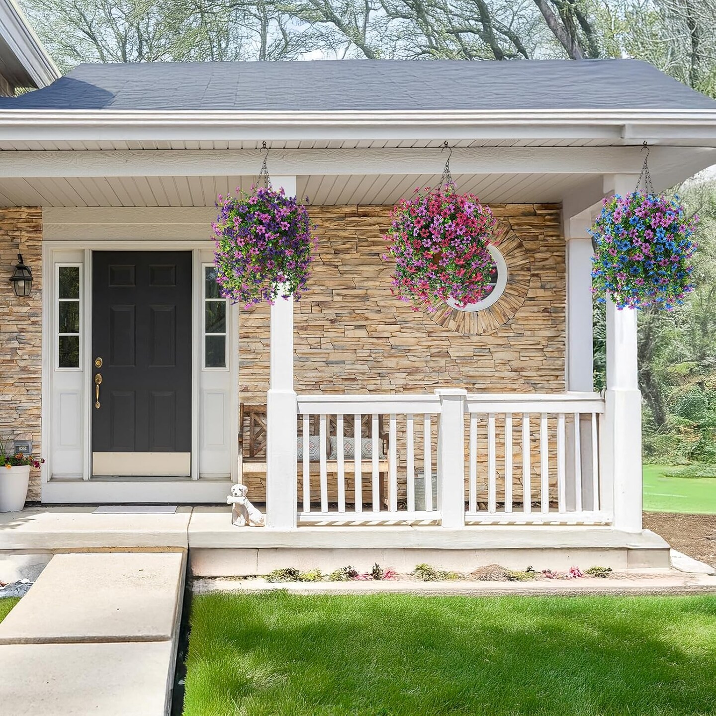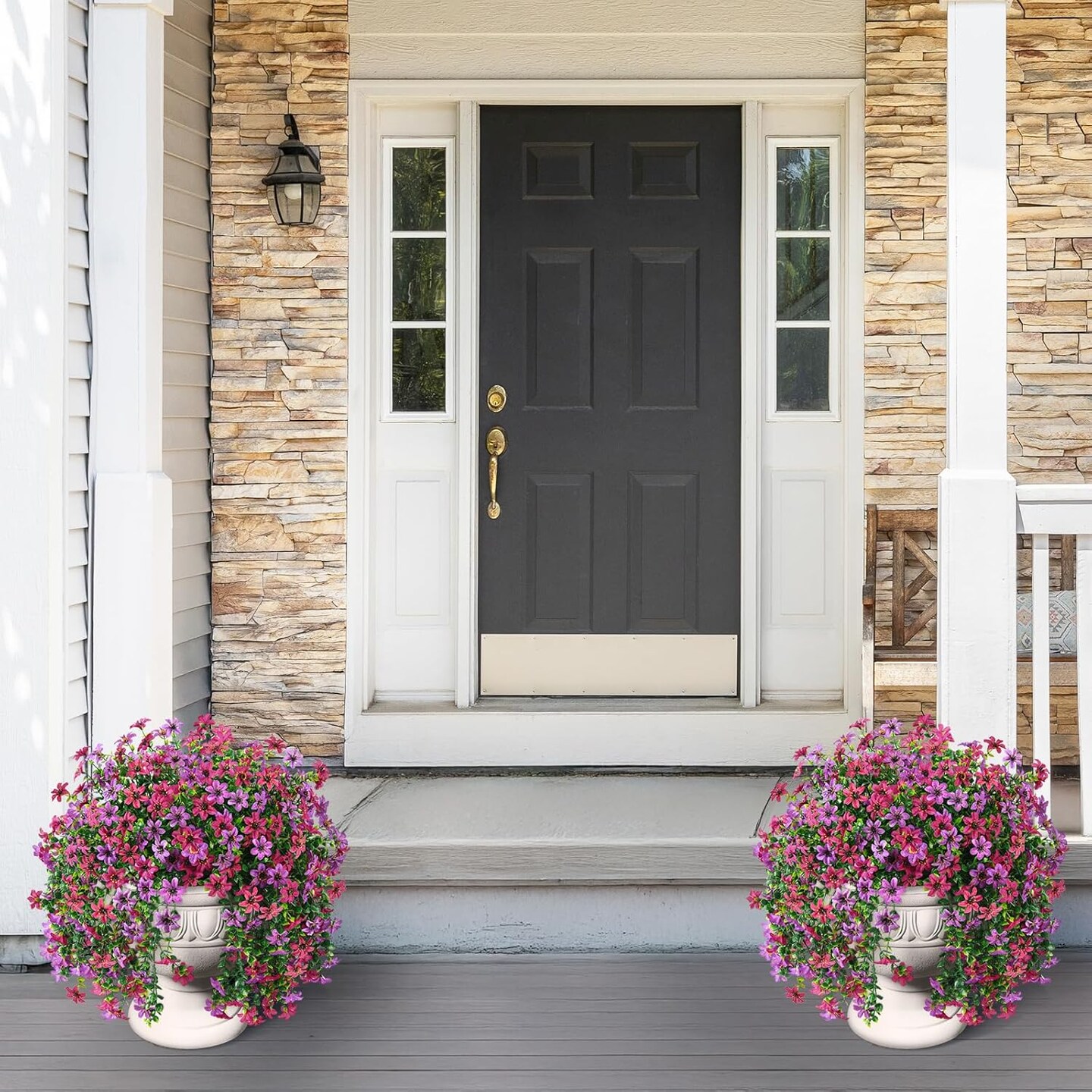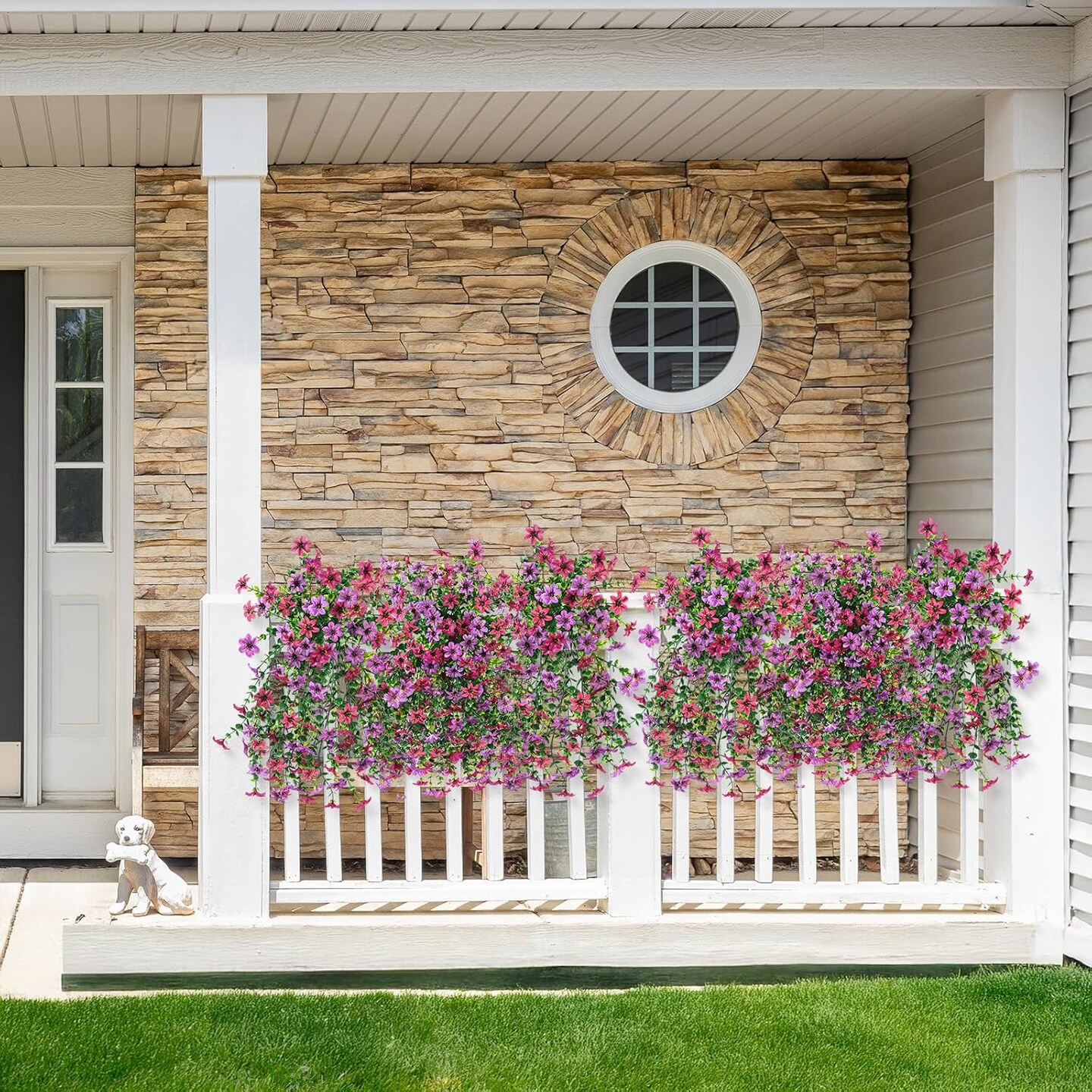 Artificial Hanging Flowers for Outdoors, 2 Pcs Fake Hanging Plant Spring Decor(Light Purple Red)