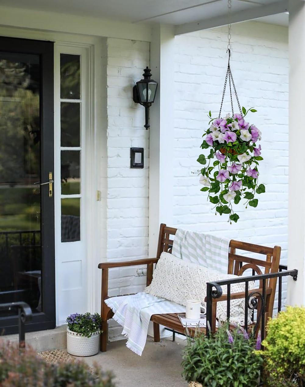 Artificial Hanging Flowers for Outdoors, Fake Hanging Morning Glory Plants & Flowers (White Purple)