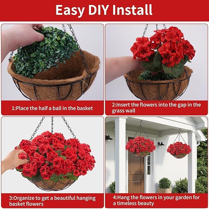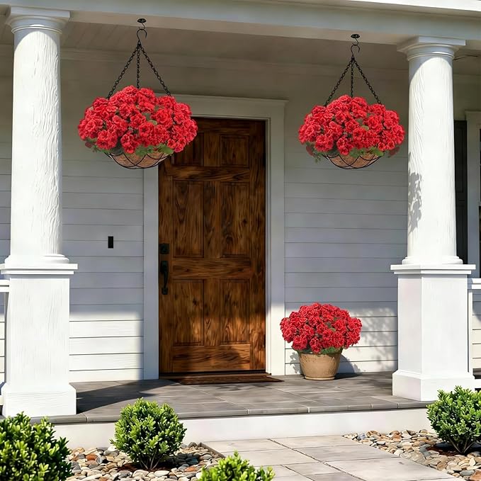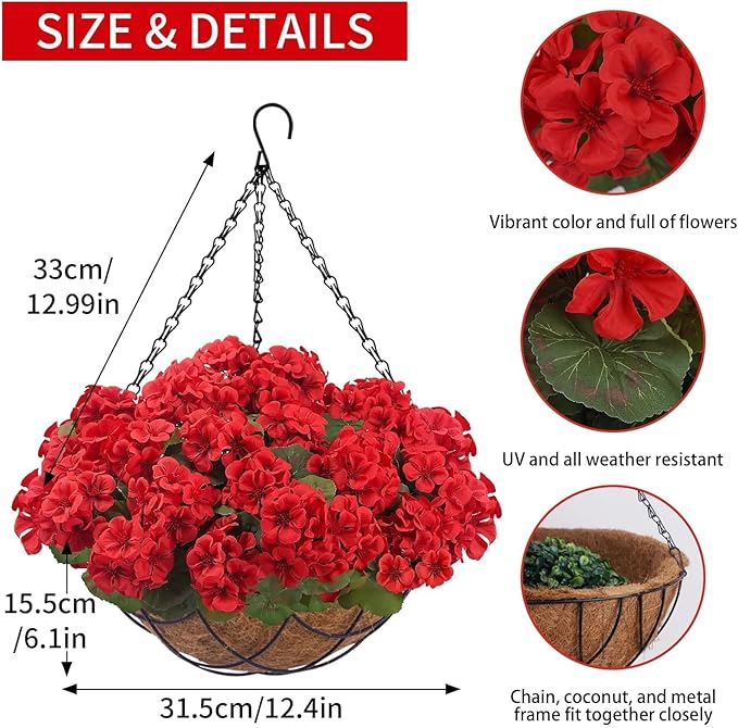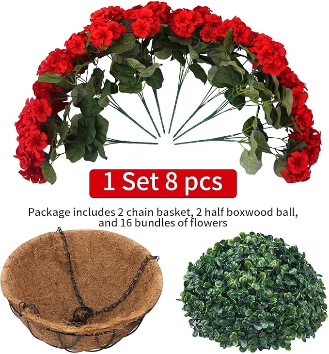 Artificial Hanging Flowers with Baskets, 2 Sets – 16 Red Fake Geraniums for Outdoor Porch, Garden, Balcony, Yard & Patio Decoration