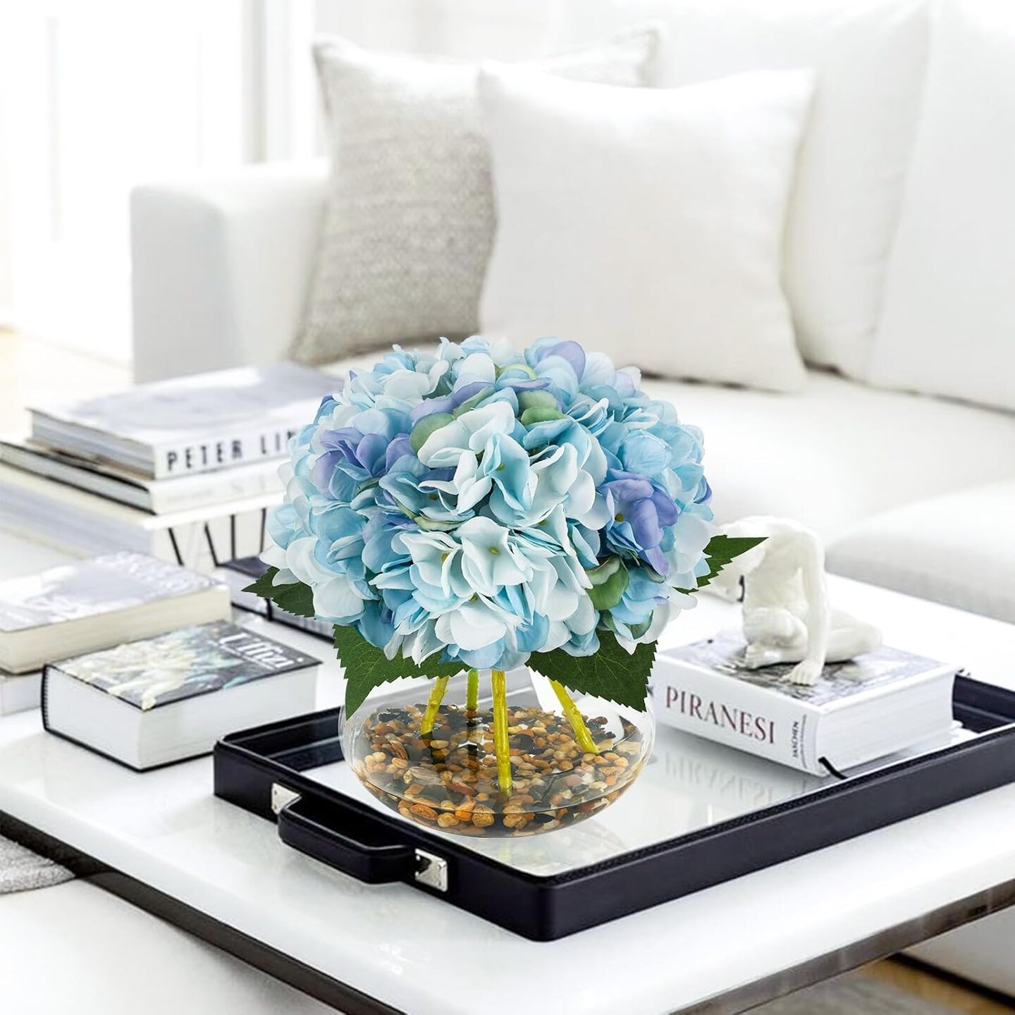 Artificial Hydrangea Flowers with Vase Blue Silk Fake Flowers Faux Hydrangea Flowers with Faux Water Riverstones for Home Office Table Room Wedding Centerpiece Decorations