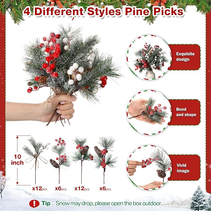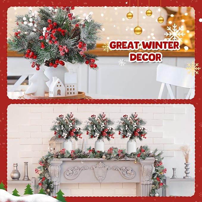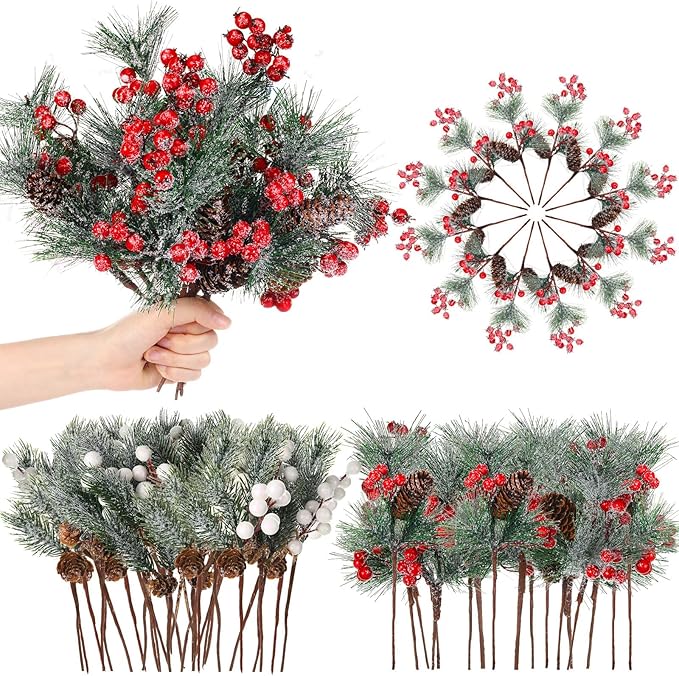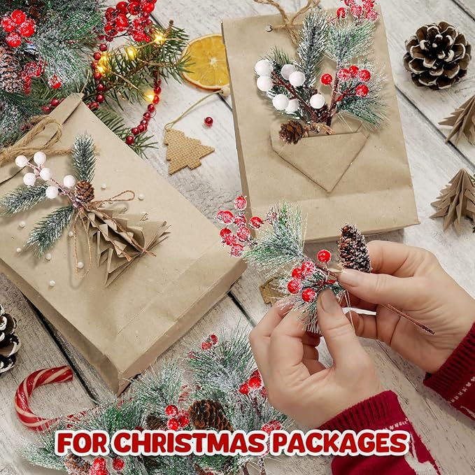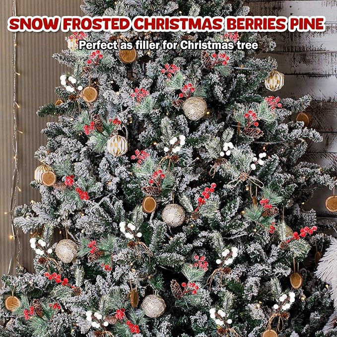 Artificial Pine Branches with Snow Spray Red Berry Stems Pine Needles Faux Pine Picks Snow Floral Pine Cones for DIY Crafts Christmas Tree Garland Wreath Holiday Decor