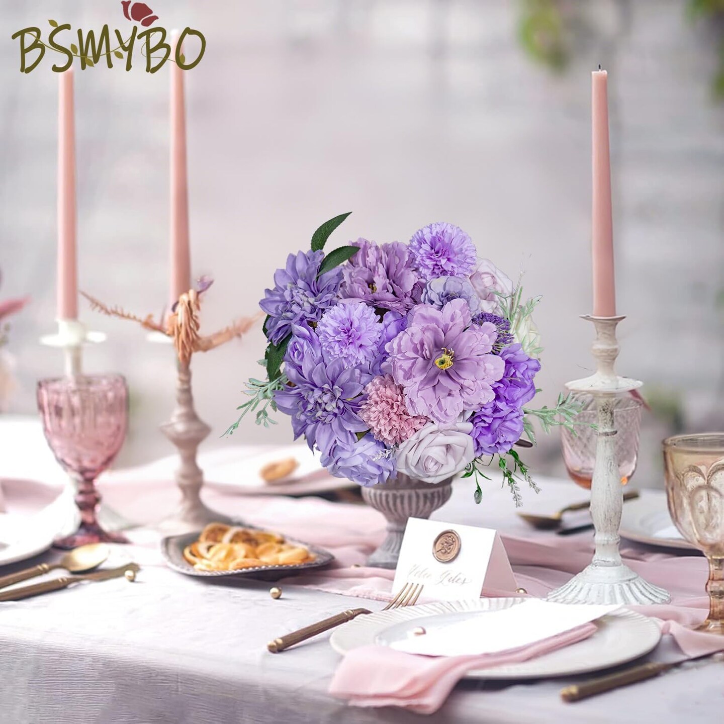 Artificial Purple Flower Bouquet – Silk Dahlias & Roses for Table Centerpieces Home Decor