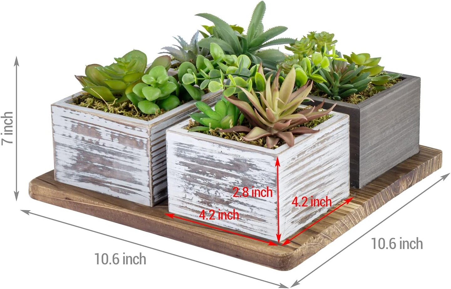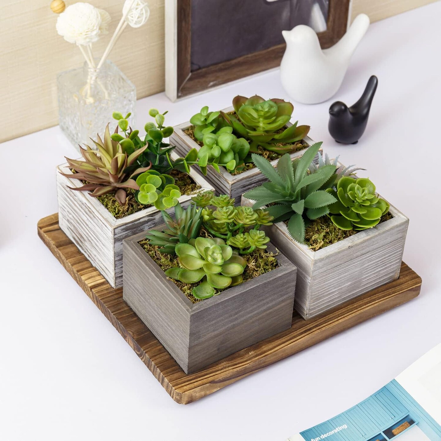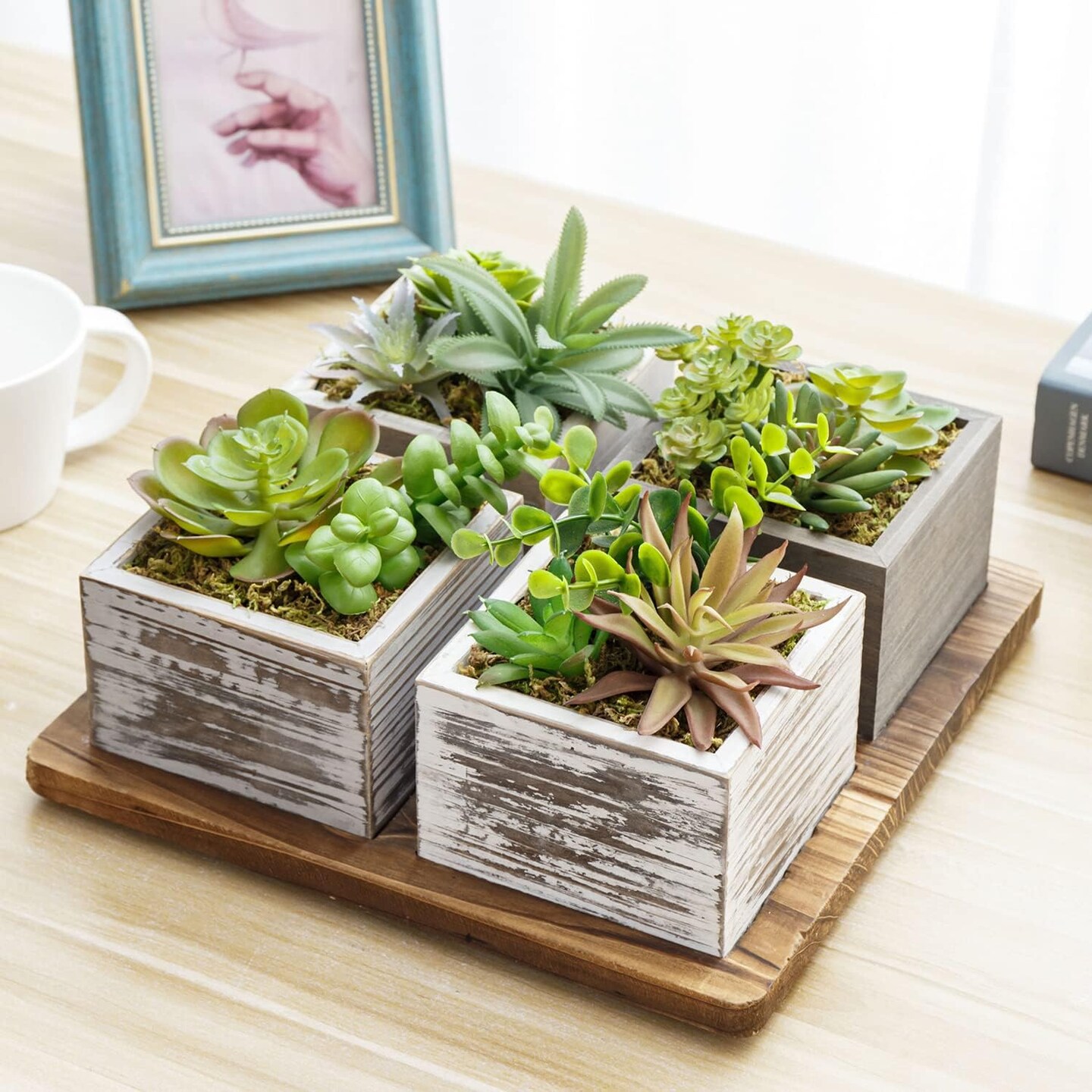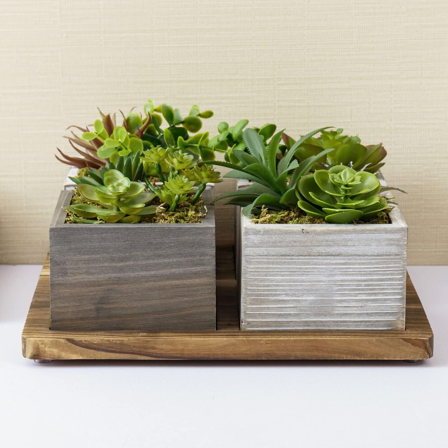 Artificial Succulent Arrangement Faux Plant Centerpiece with Decorative Rustic Wood Planter Boxes on Base Tray
