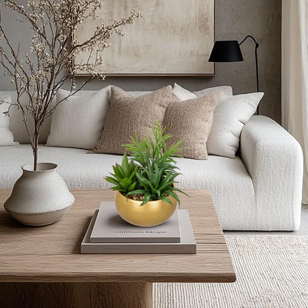 Artificial Succulent Small Potted Plant in Gold Metal Pot – Faux Lifelike Desk & Home Tabletop Centerpiece Decor for Office, Bathroom & Living Room