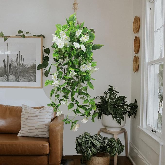 Artificial Vines for Decoration with Flowers 2 Pcs Hanging Plants Silk Garland White Morning Glory Vine Artificial Plants Outdoors 15Feet Fake Vine Plants for Wedding Indoor Wall Fence Baskets