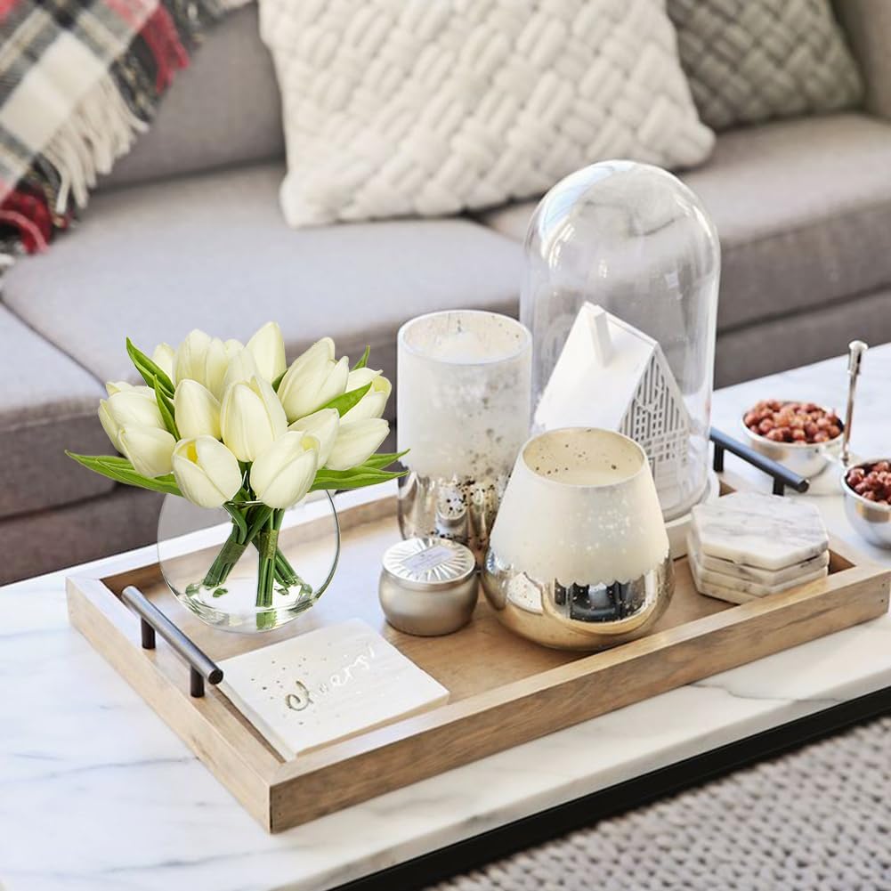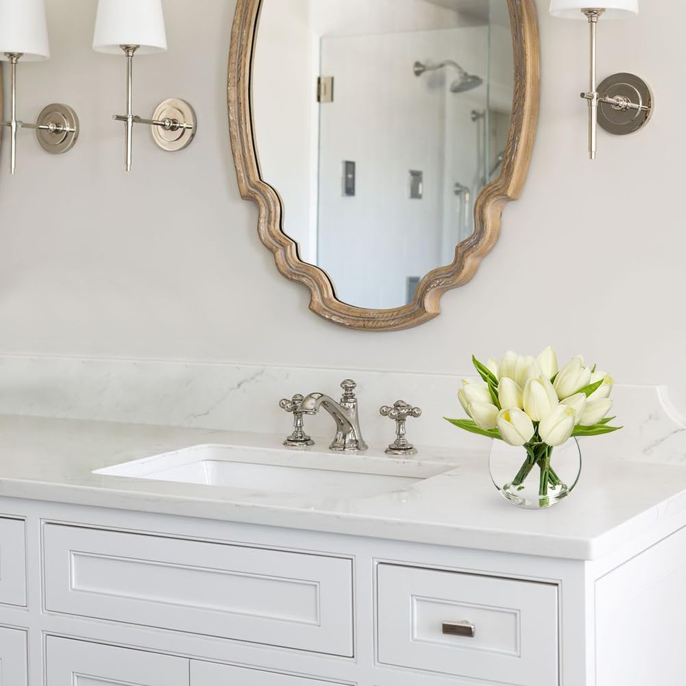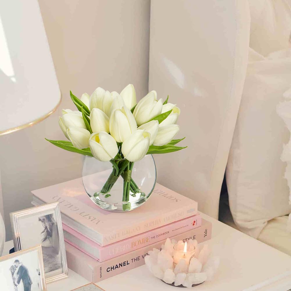Artificial White Tulips in Vase with Faux Water 6" Real Touch Flowers Fake Tulips Small Flowers Arrangement in Round Glass Vase for Mother's Day Table Centerpiece Wedding Home Decor