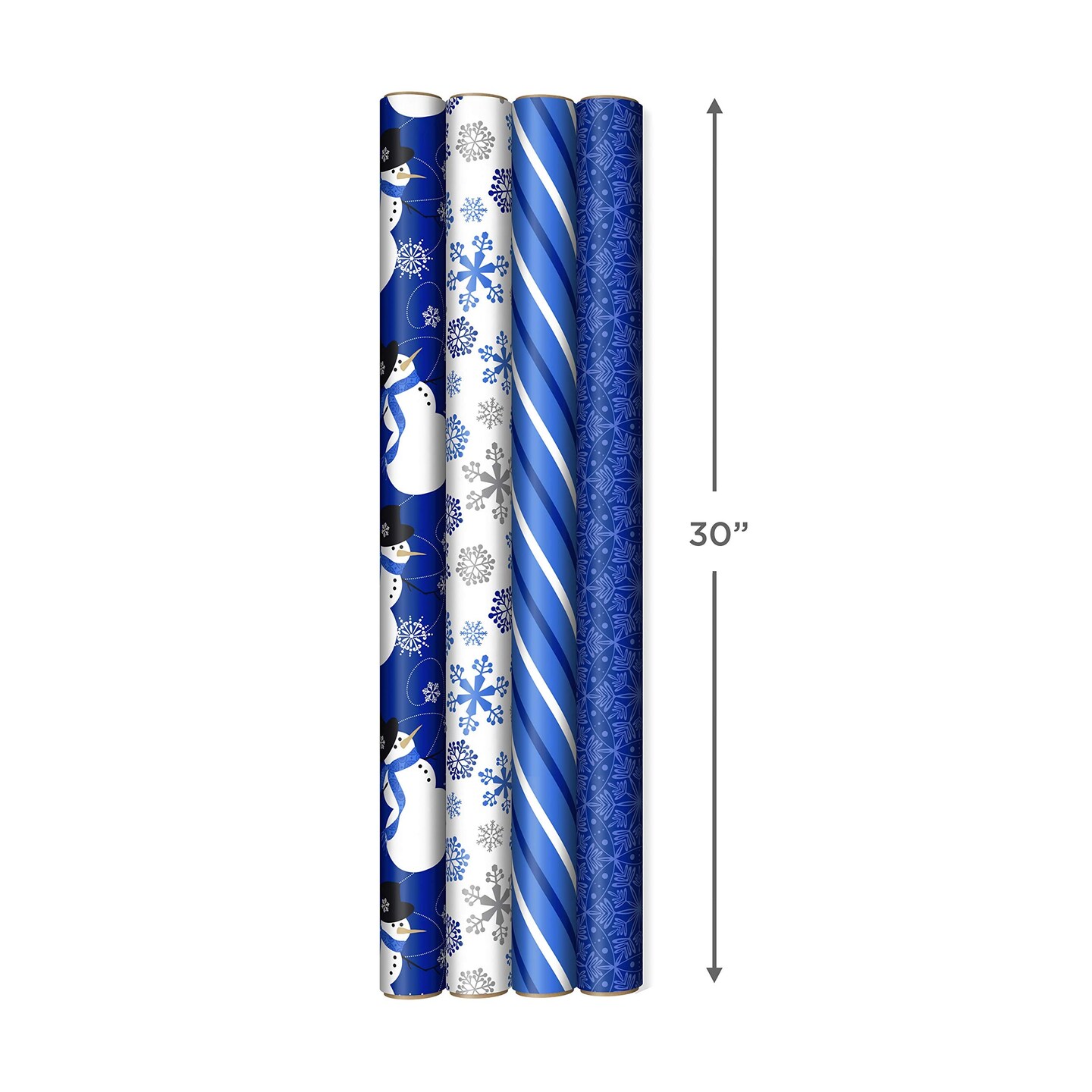 Arts Blue Christmas Wrapping Paper with Cut Lines on Reverse (4 Rolls: 120 sq. ft. ttl) Snowmen, Snowflakes, Blue and White Stripes