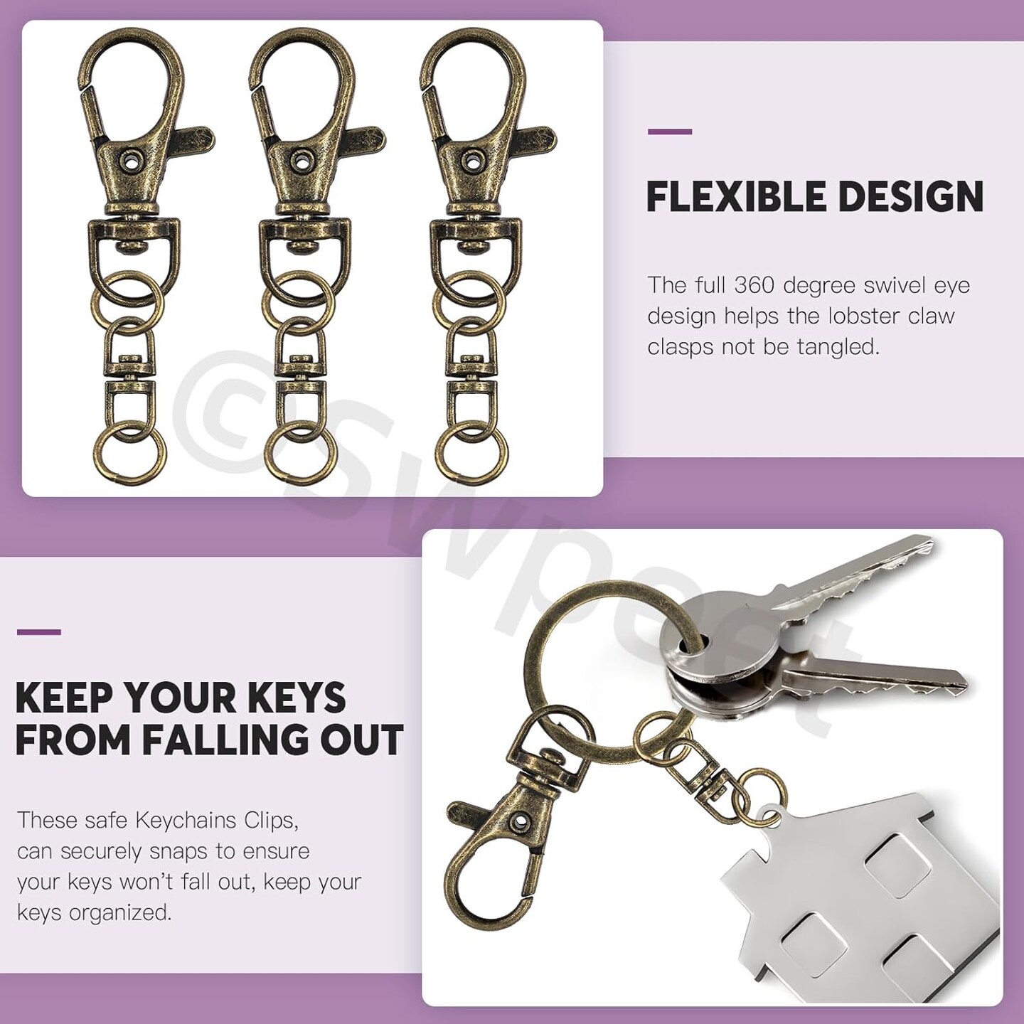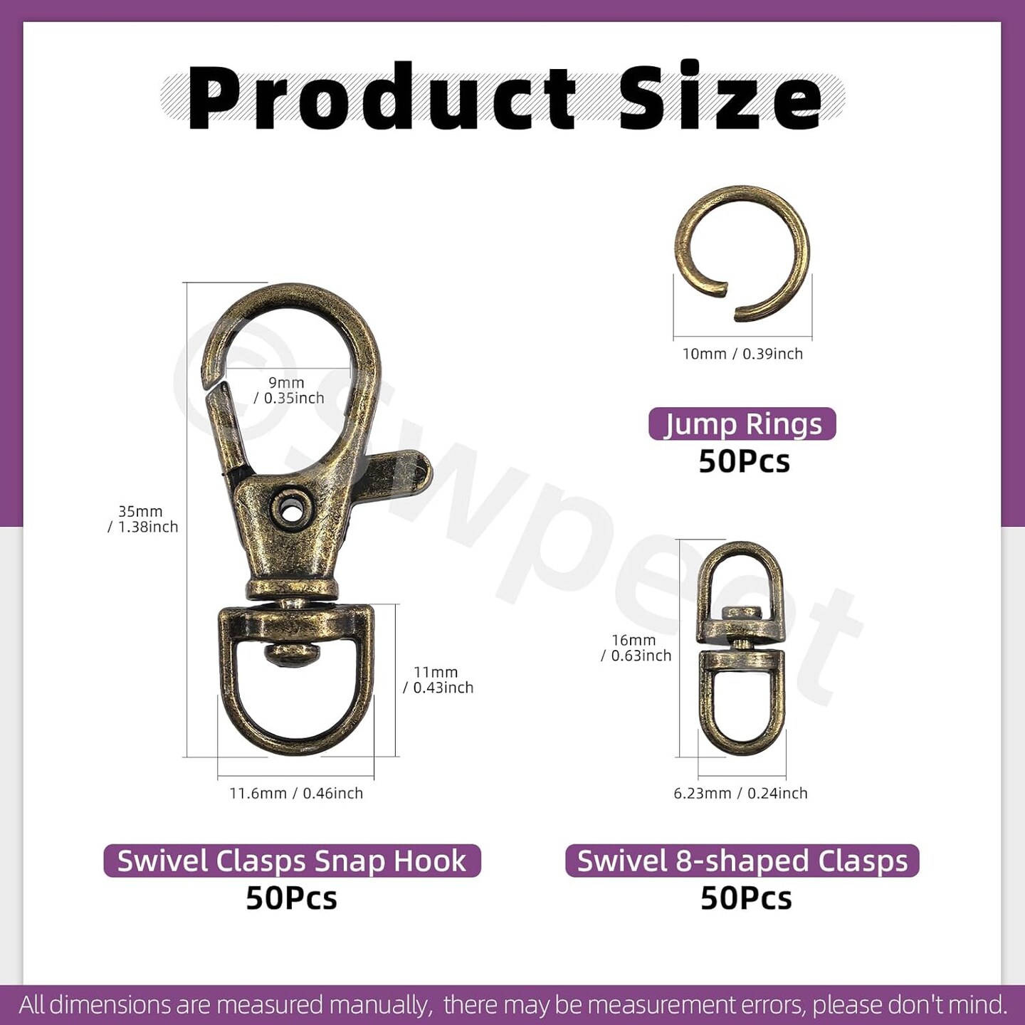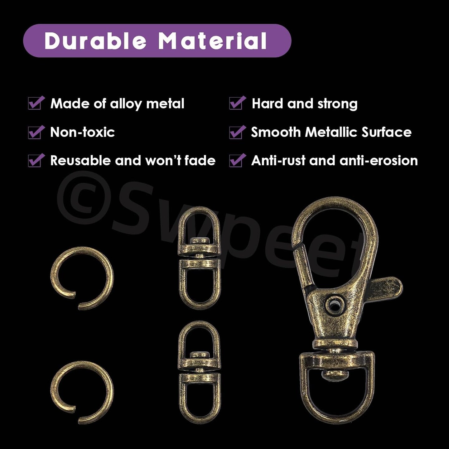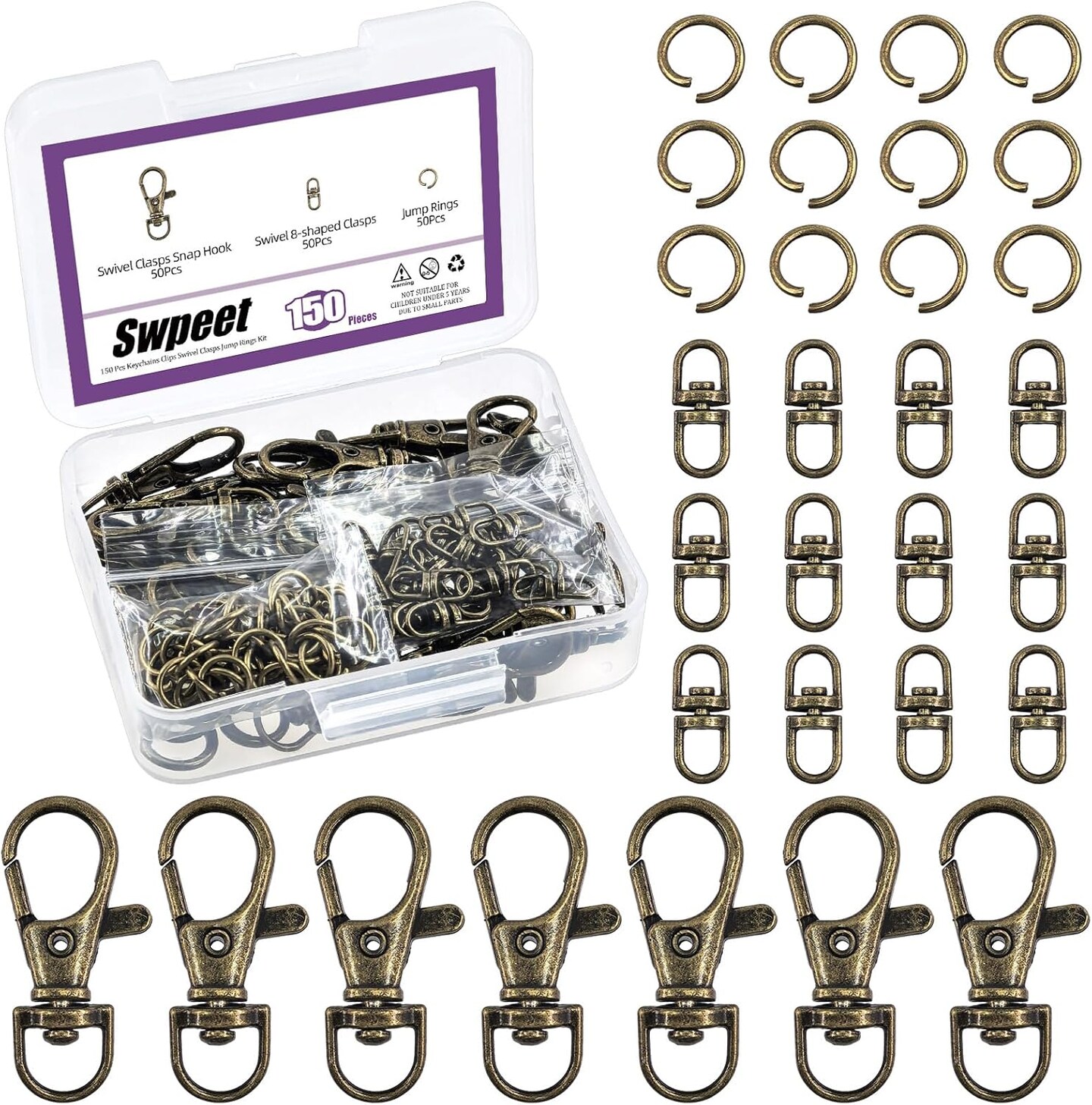 Assorted 150-Piece Bronze Keychain Making Kit – Includes 50 swivel lobster claw clasps, 50 rotating 8-shaped buckle clasps, 50 jump rings, swivel trigger hooks, and swivel lanyard snap hooks.