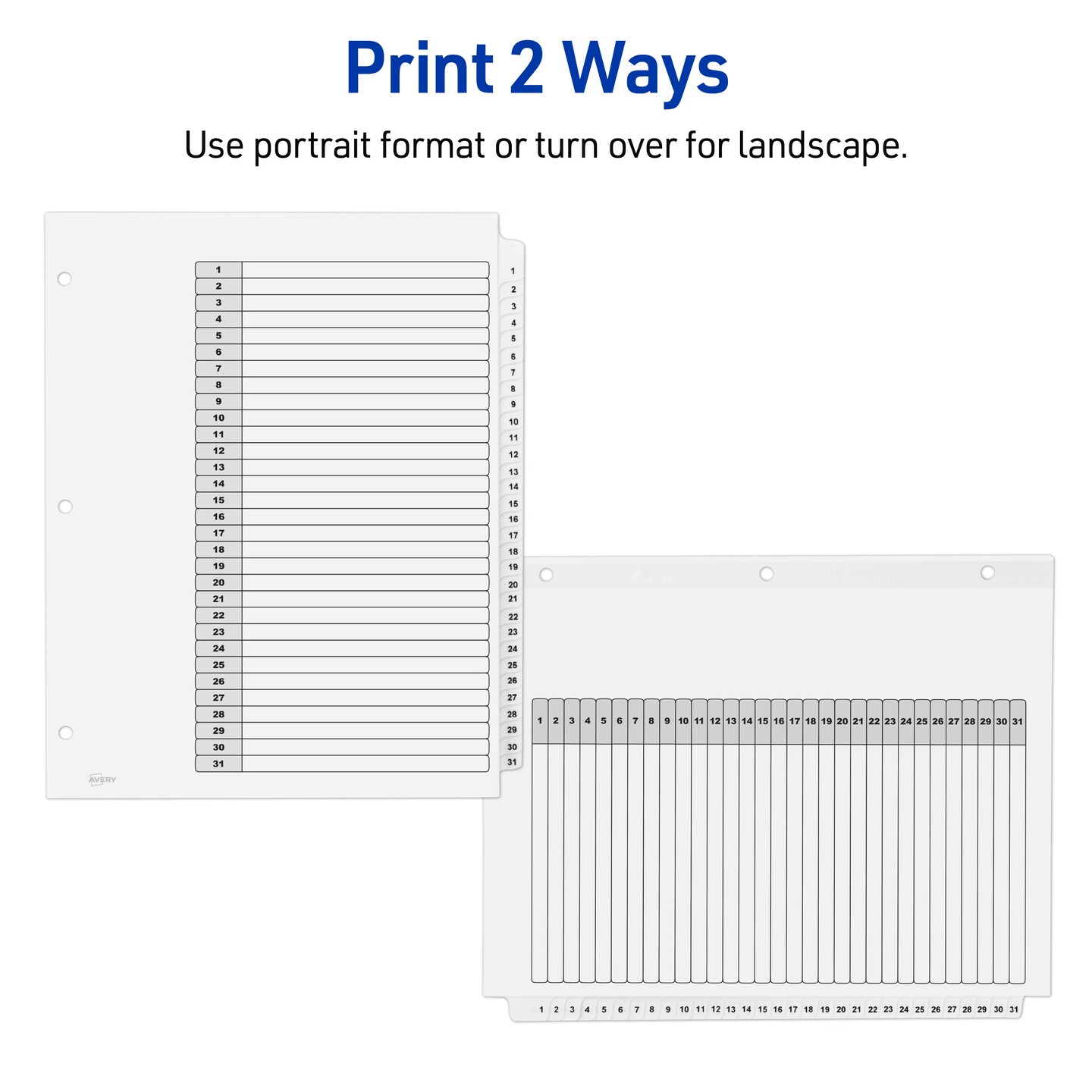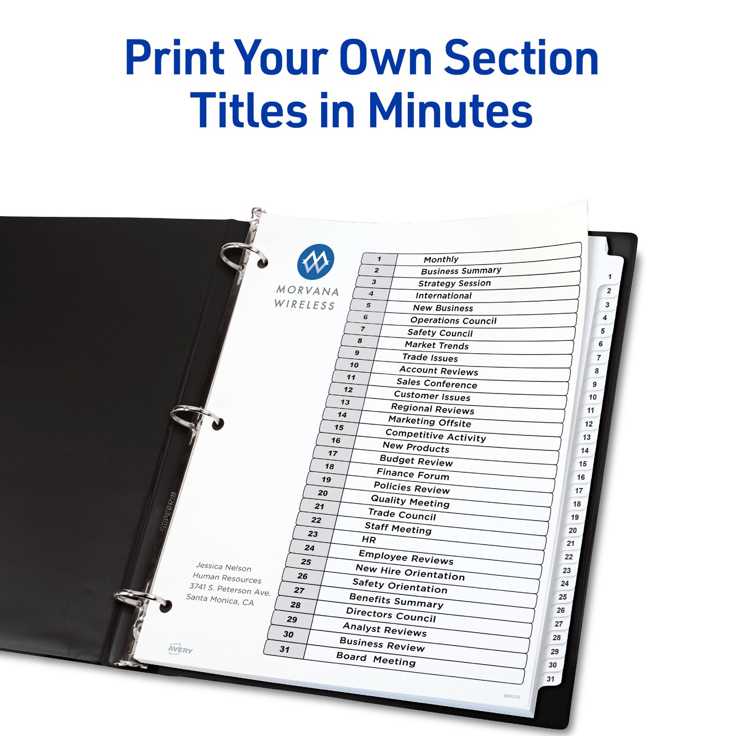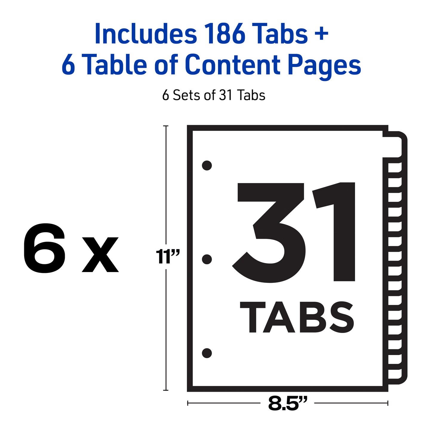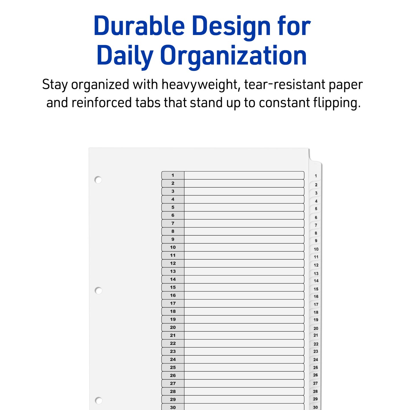 Avery 1-31 Dividers for 3 Ring Binders, 31 Tabs per Set, Customizable Table of Contents, Classic White Tabs (6 Sets of 11827)