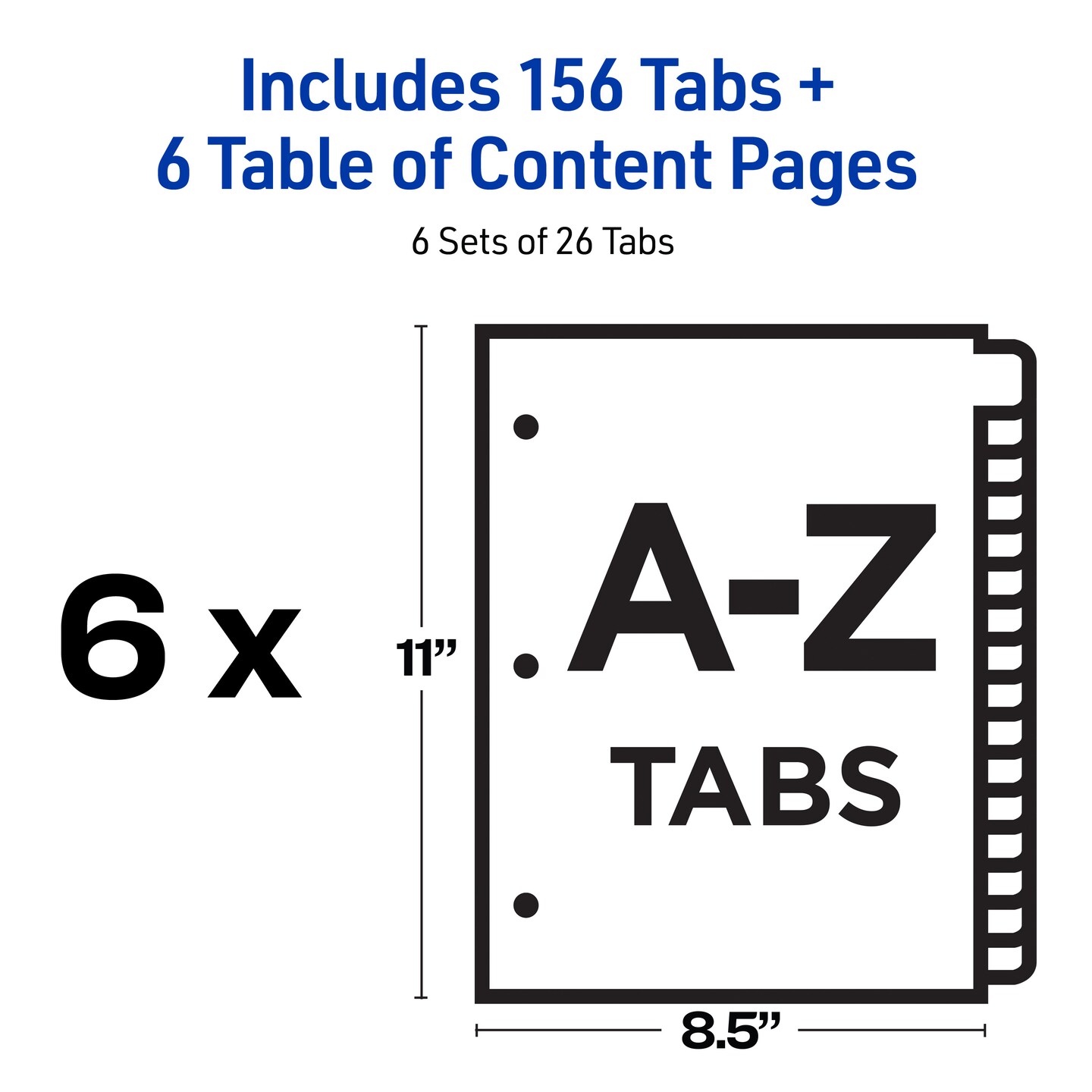 Avery A-Z Dividers for 3 Ring Binders, 26 Tabs per Set, Customizable Table of Contents, Multicolor Tabs (6 Sets of 11832)