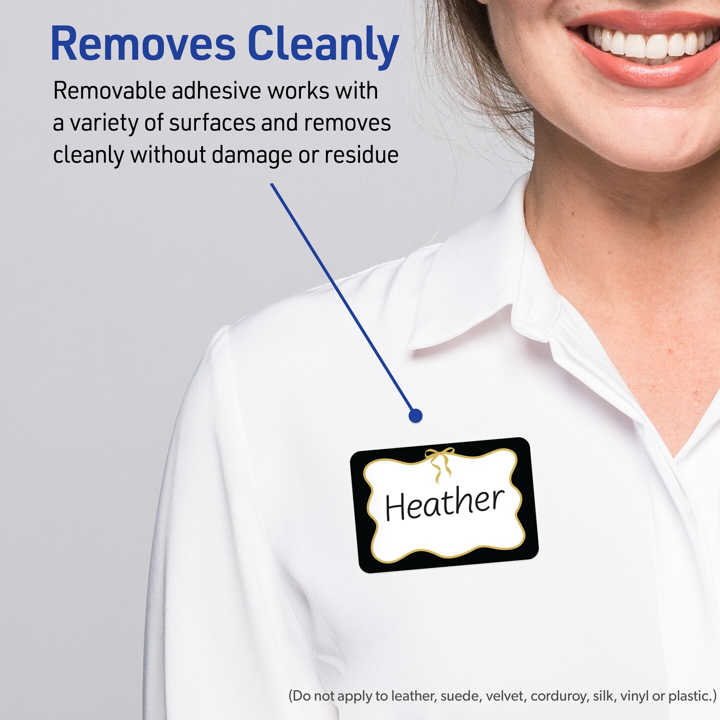 Avery Printable Adhesive Name Badges, 2-1/3" x 3-3/8", Pre-printed Black Border with Metallic Gold Bow Design, Matte White, Laser & Inkjet Compatible, 80 Total
