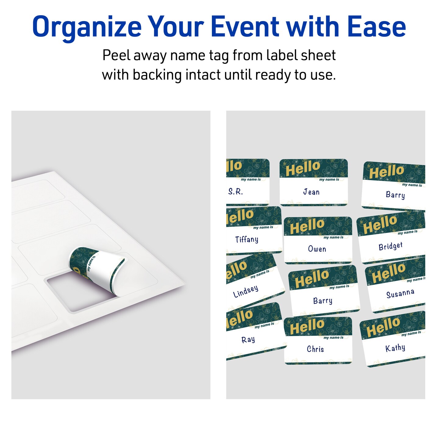 Avery Printable Adhesive Name Tags, 2-1/3" x 3-3/8", Pre-printed Teal Floral & Metallic Gold Hello My Name Is Design, 80 Total