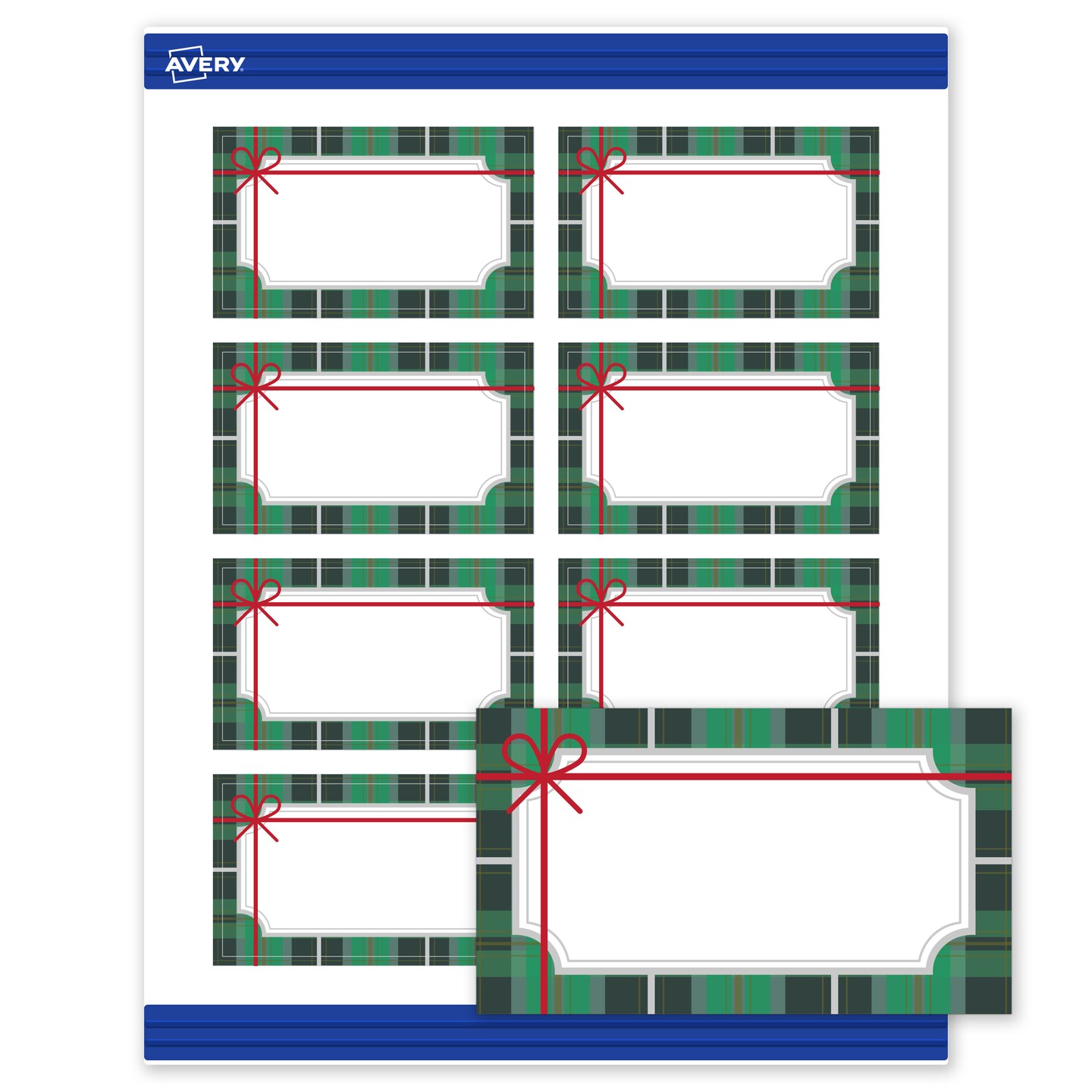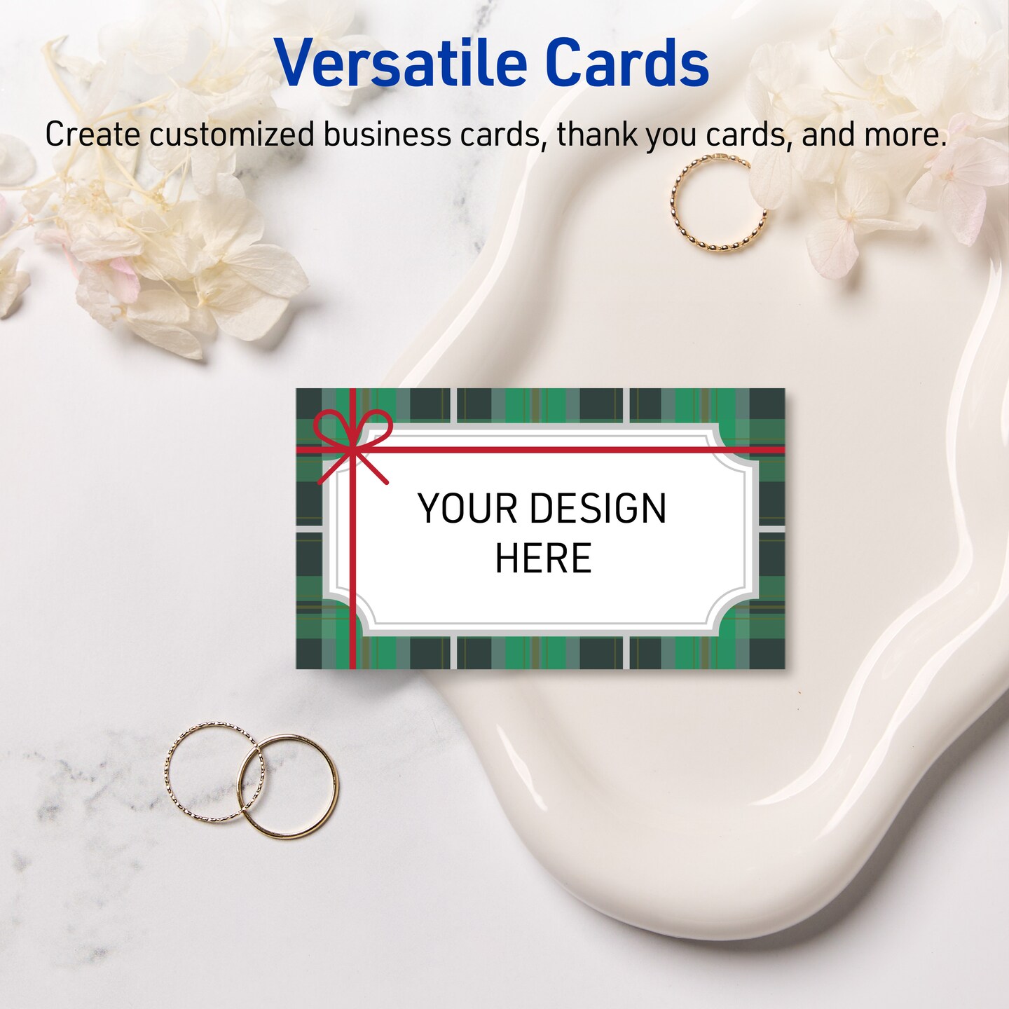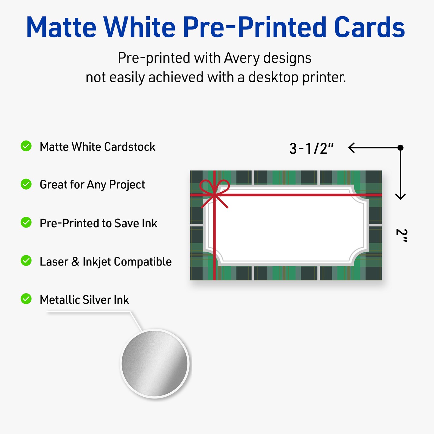 Avery Printable Business Cards with Sure Feed Technology, Rectangle, 2" x 3-1/2", Pre-Printed Green & Metallic Silver Plaid with Red Bow, Matte White, Laser & Inkjet Compatible, 80 Total
