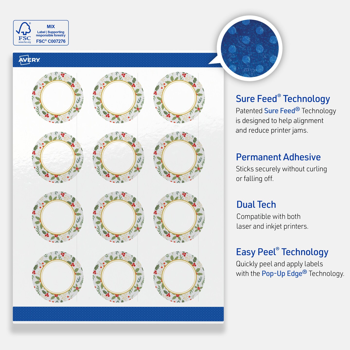Avery Printable Christmas Labels with Sure Feed Technology, Round, 2" Diameter, Pre-Printed Light Blue Border with Metallic Gold Frame Design, Glossy White, Laser & Inkjet Compatible, 120 Total