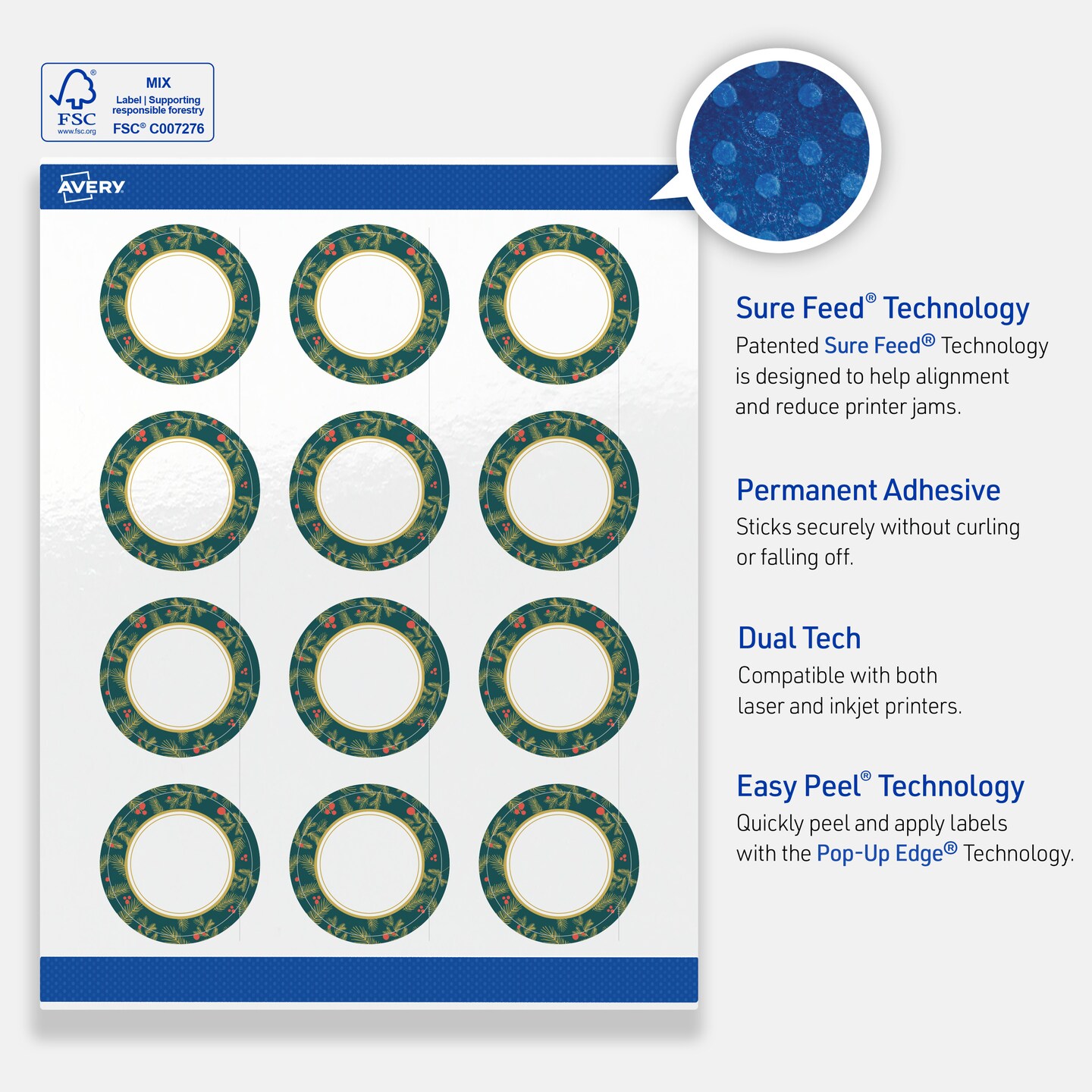 Avery Printable Christmas Labels with Sure Feed Technology, Round, 2" Diameter, Pre-Printed Teal & Metallic Gold Border with Holly Design, Glossy White, Laser & Inkjet Compatible, 120 Total