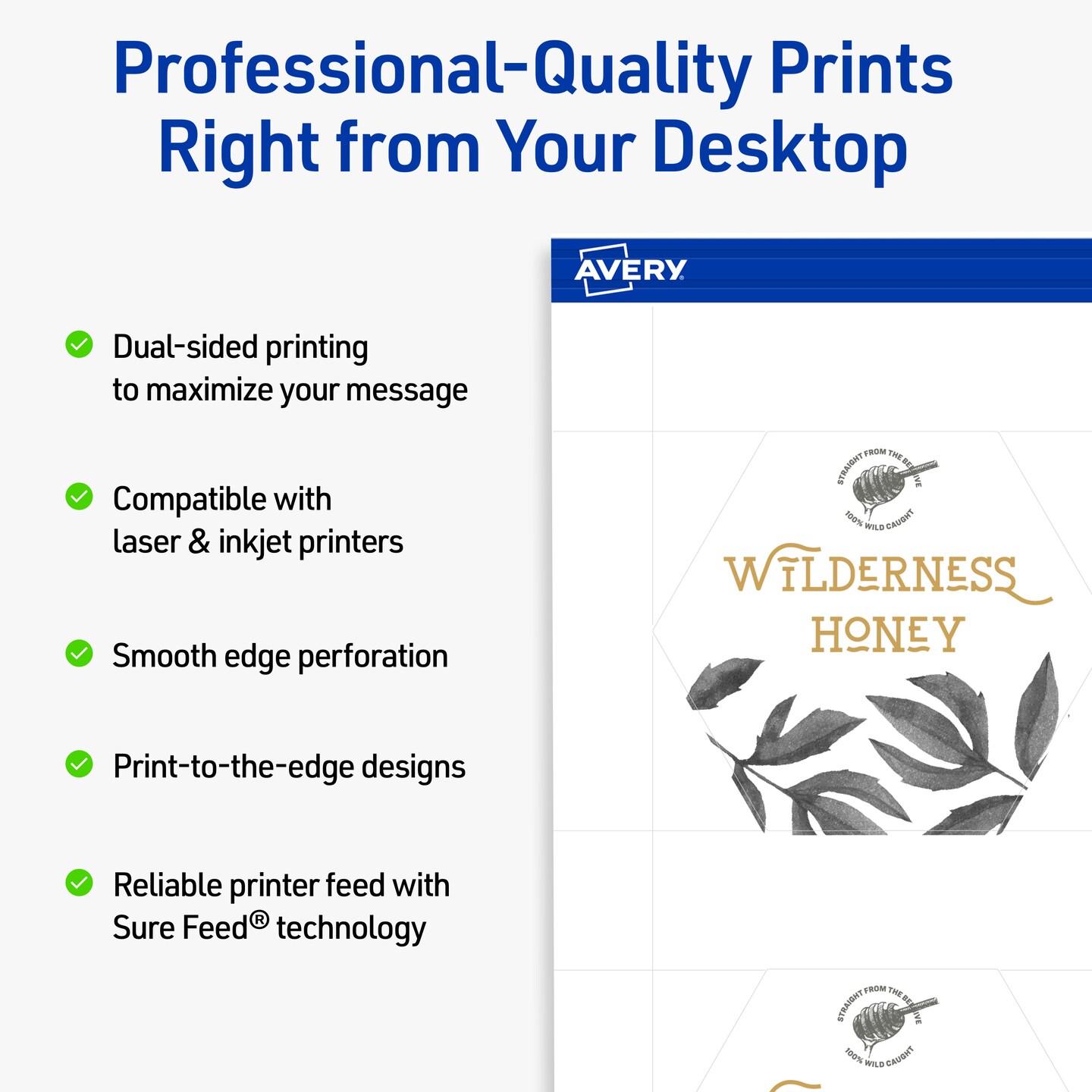 Avery Printable Hexagon Business Cards, Sure Feed Technology, 2-1/2" x 2-9/10", Matte White Cardstock, Print-to-The-Edge, Laser/Inkjet Printable, 60 Total