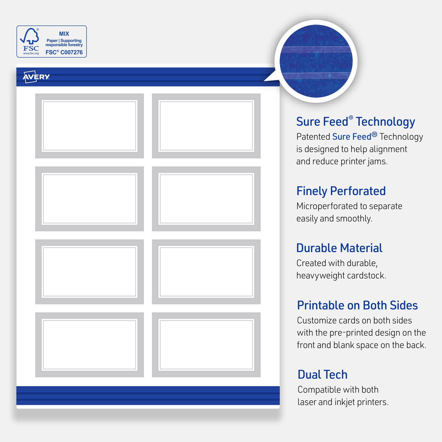Avery Printable Rectangle Business Cards with Sure Feed Technology, Pre-Printed Silver Mirror Metallic Design, Matte White, 2" x 3-1/2", Laser & Inkjet Compatible, 80 Total