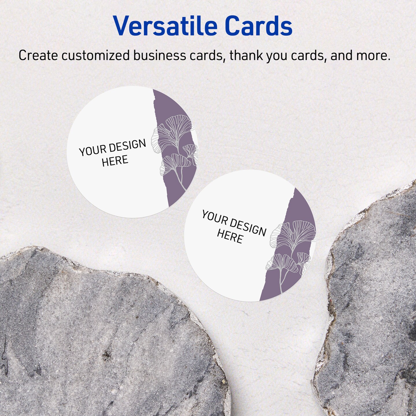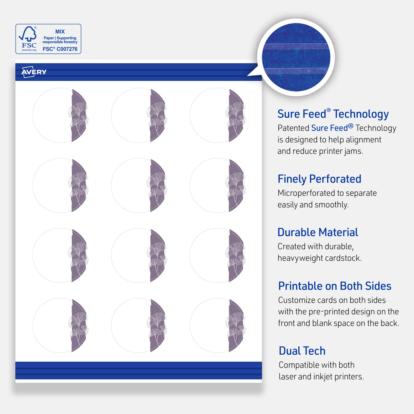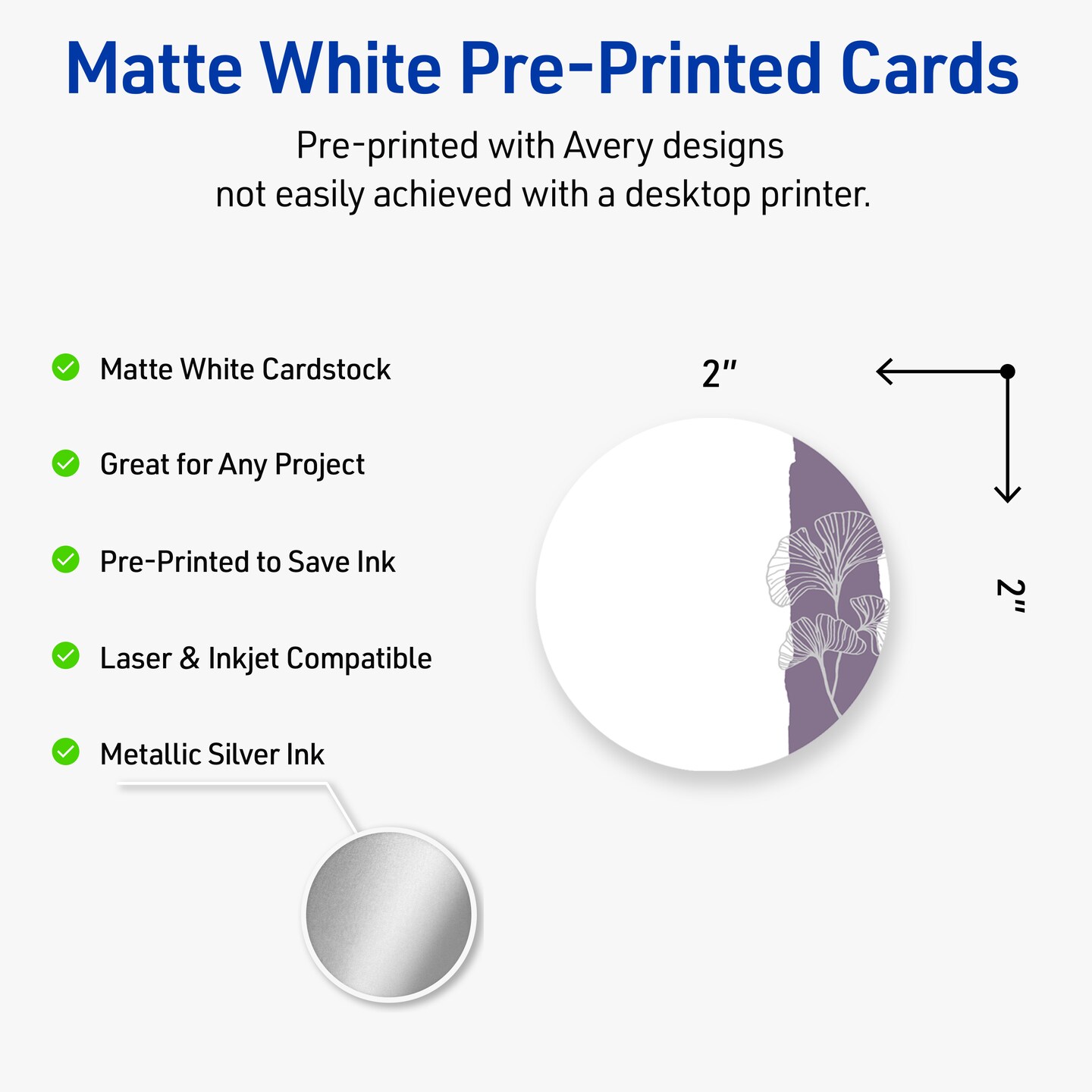 Avery Printable Round Business Cards with Sure Feed Technology, Pre-Printed Purple and Silver Gingko Leaves Design, Matte White, 2" Diameter, Laser & Inkjet Compatible, 120 Total