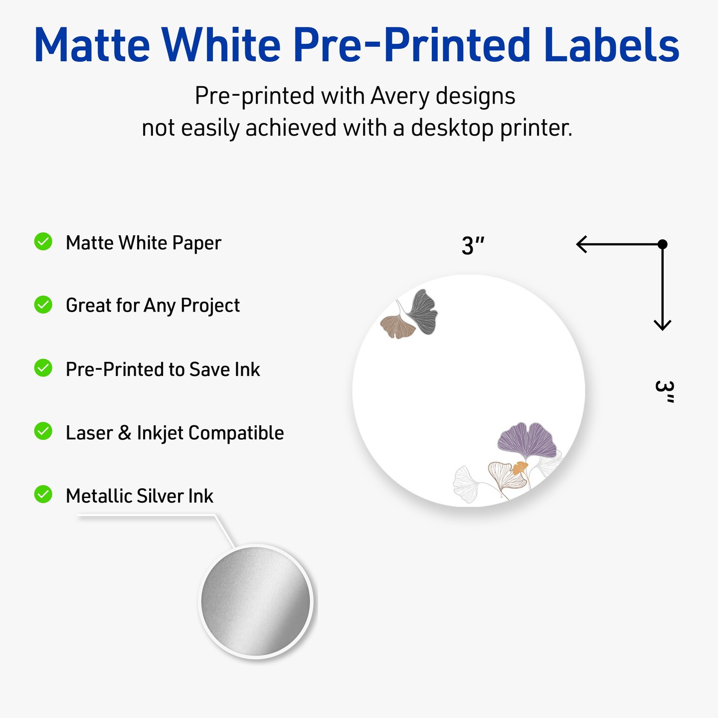 Avery Printable Round Labels with Sure Feed Technology, Pre-Printed Silver Metallic with Gingko Leaves Design, Matte White, 3" Diameter, Laser & Inkjet Compatible, 60 Total