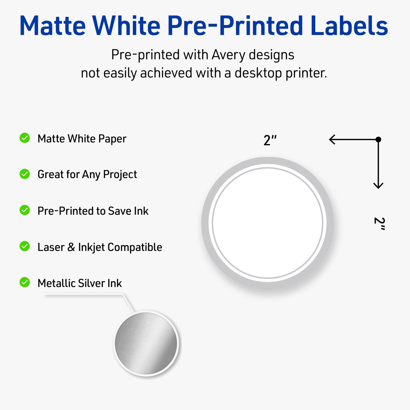 Avery Printable Round Labels with Sure Feed Technology, Pre-Printed Silver Mirror Metallic Design, Matte White, 2" Diameter, Laser & Inkjet Compatible, 120 Total