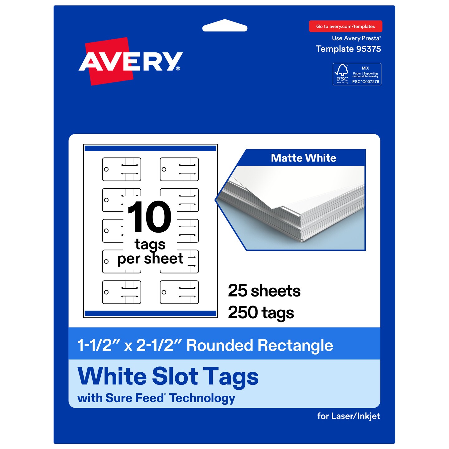 Avery Printable Rounded Rectangle Slot Tags, Sure Feed Technology, 1-1/2" x 2-1/2", Matte White Cardstock, Print-to-The-Edge, Laser/Inkjet Printable, 100 Total