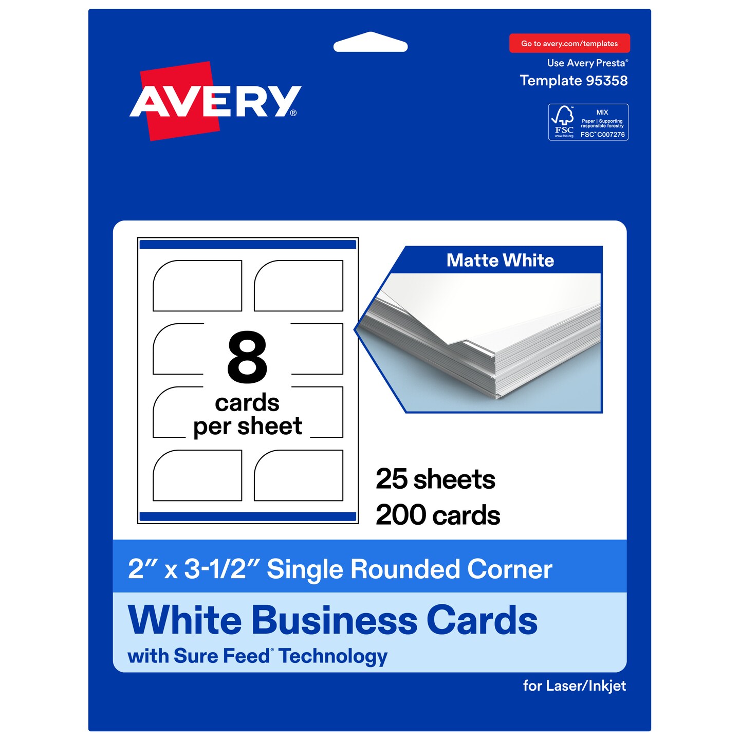 Avery Printable Single Rounded Corner Rectangle Business Cards, Sure Feed Technology, 2" x 3-1/2", Matte White Cardstock, Print-to-The-Edge, Laser/Inkjet Printable, 80 Total