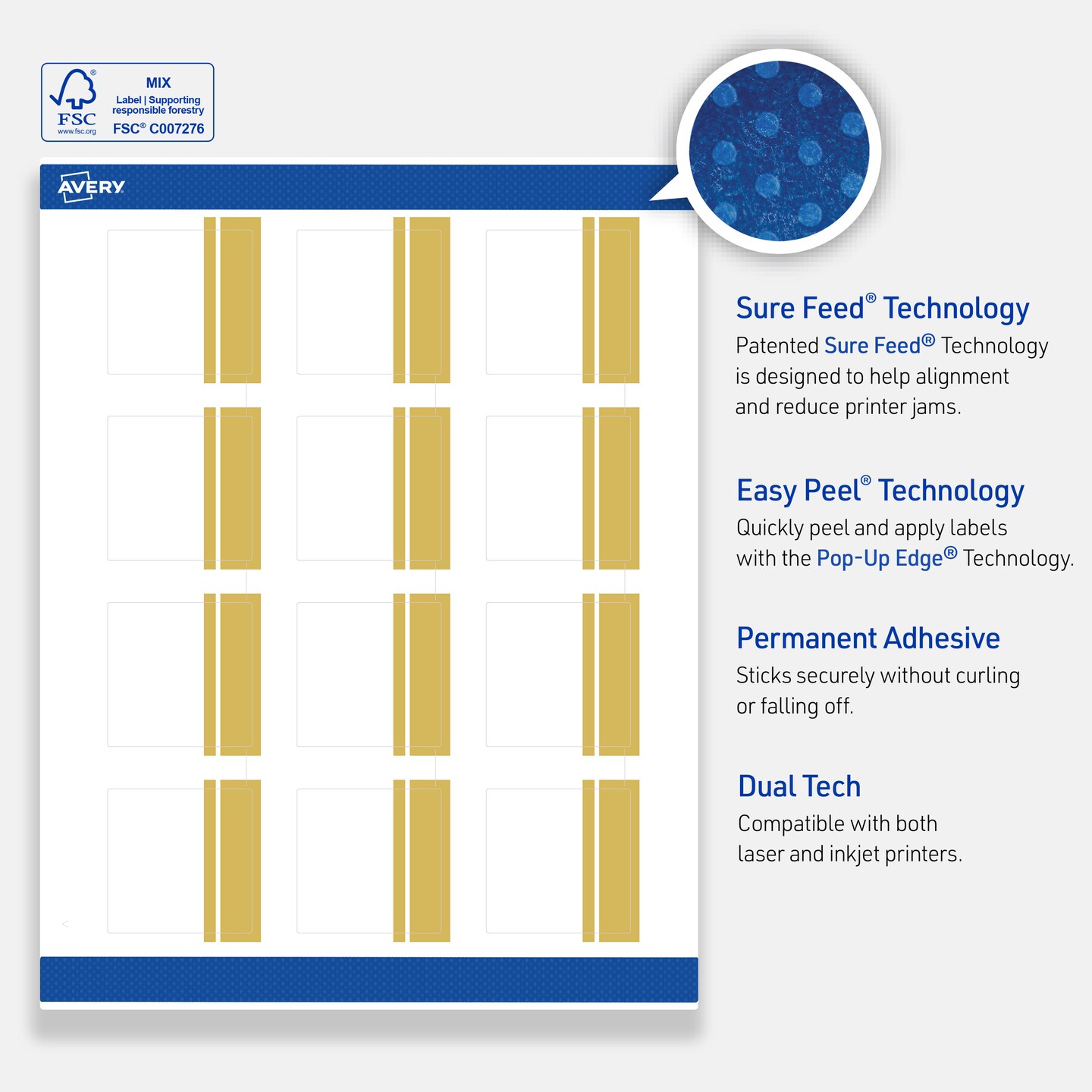 Avery Printable Square Labels, Gold Double-Dipped Edge, 2" x 2", Matte White Square Labels, Permanent, Laser/Inkjet, 120ct, Great for Product Labels