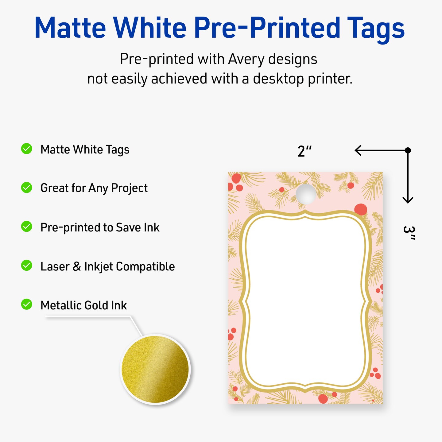 Avery Printable Tags with Sure Feed Technology, Rectangle, 2" x 3", Pre-Printed Pink & Metallic Gold Border with Holly Design, Matte White, Laser & Inkjet Compatible, 80 Total