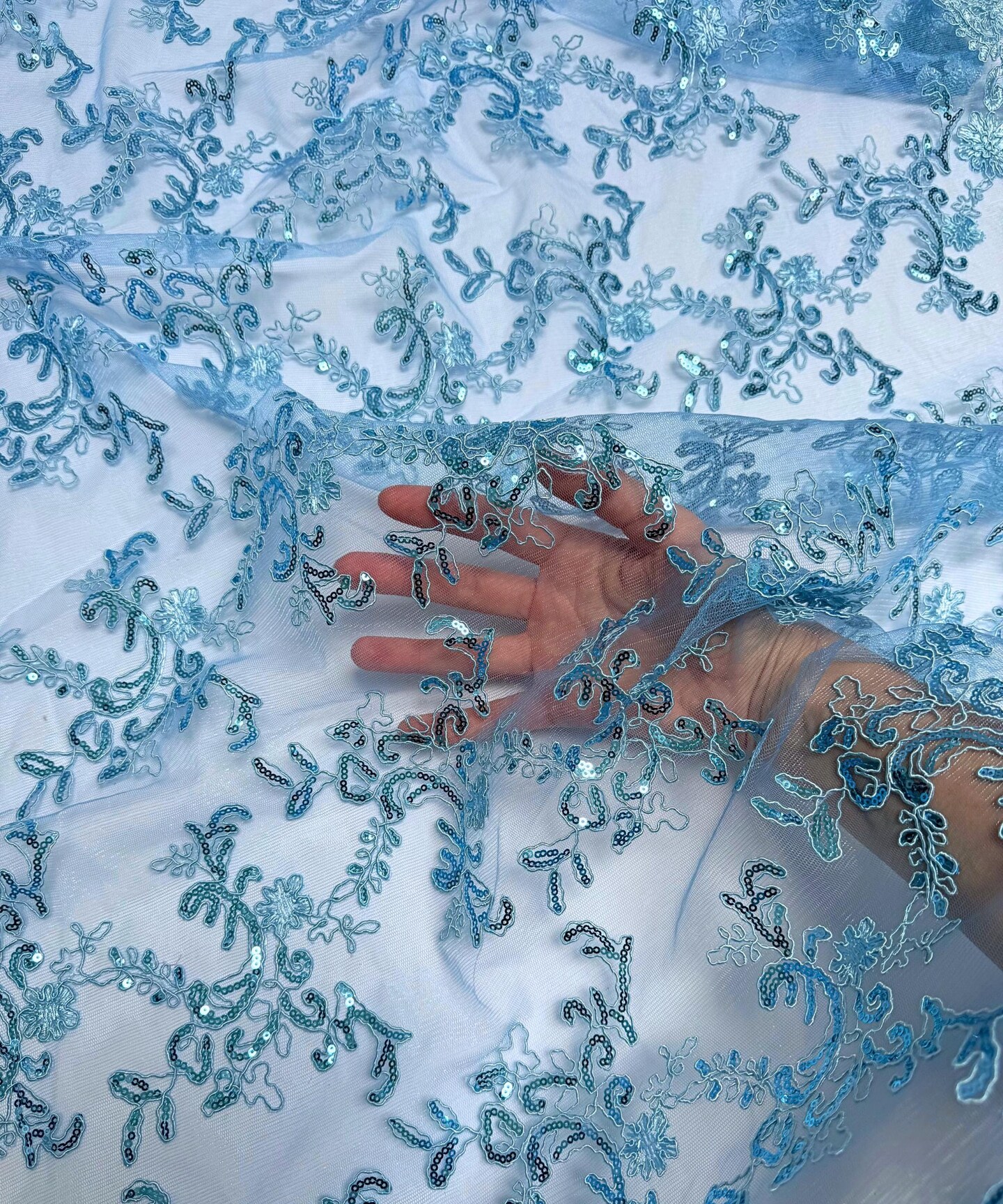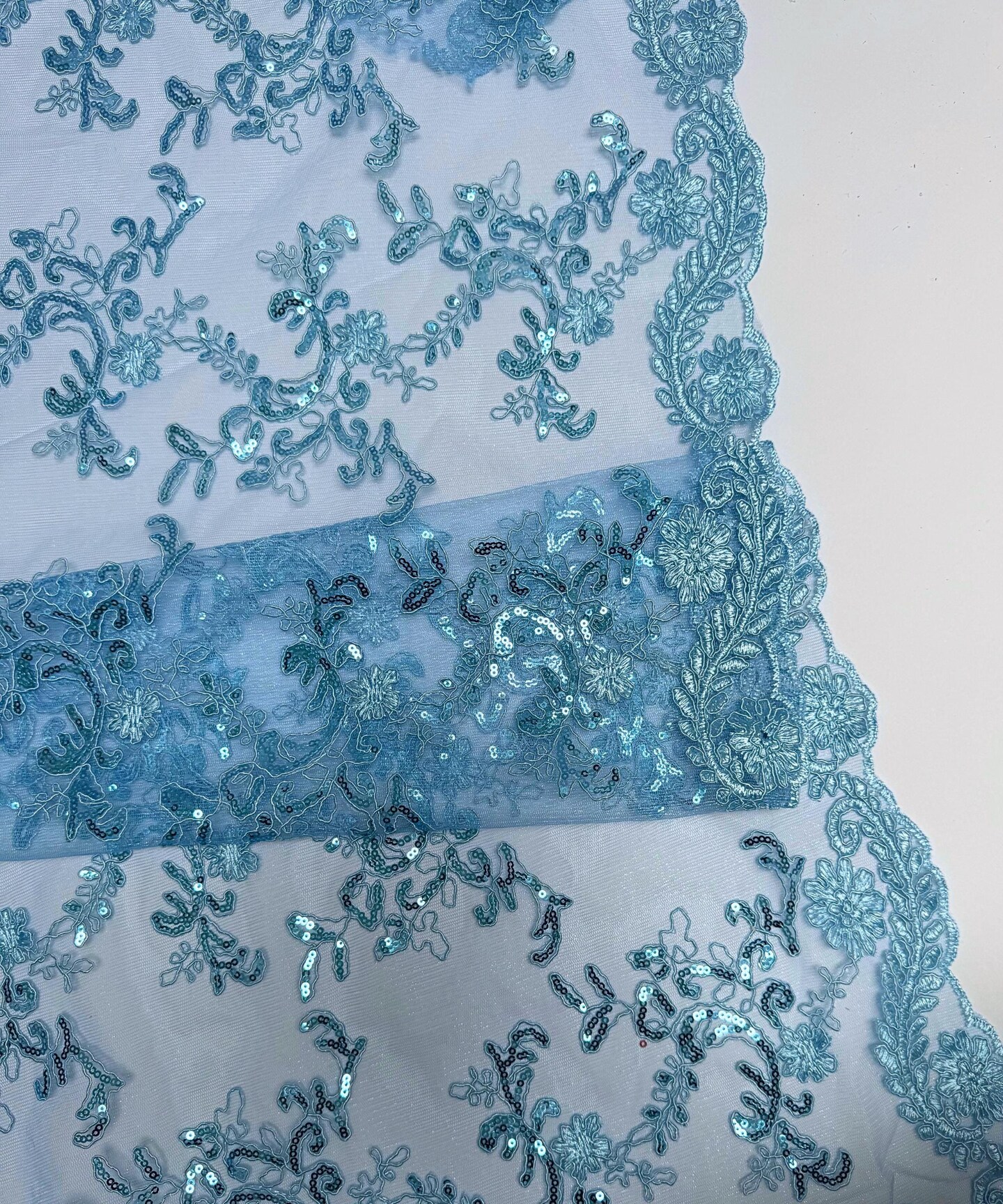 Baby Blue Sequin Embroidered Lace Fabric by the Yard, 54" Wide Floral Mesh Lace with Double Scalloped Edges