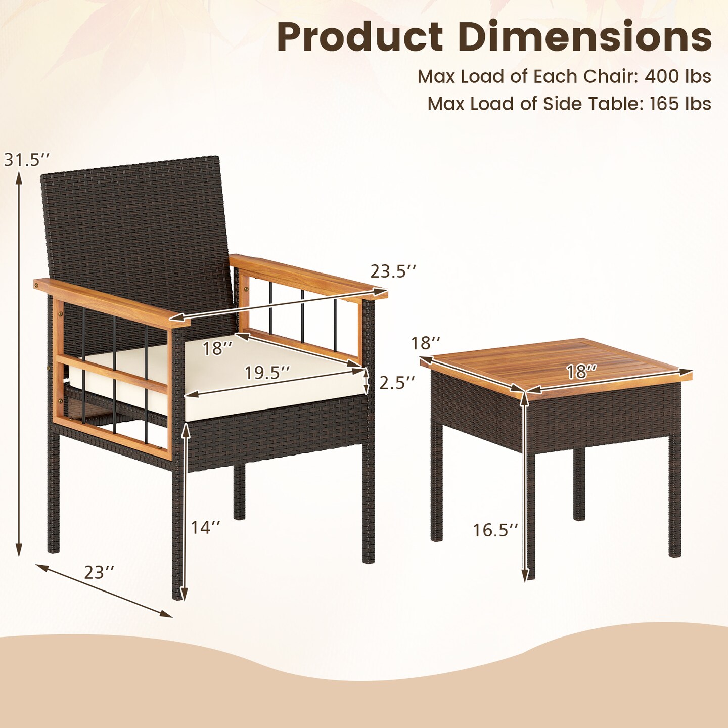 Balcony 3-Piece Wicker Set Acacia Wood Tabletop with Comfortable Armrest Chairs