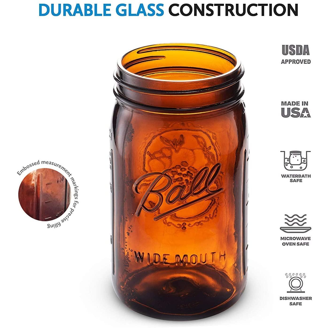Ball Amber Glass Wide Mouth Mason Jars (32 oz/ Quart ) 12 Pack. With Airtight lids and Bands - Amber Canning Jar - UV light Protection - Microwave & Dishwasher Safe.