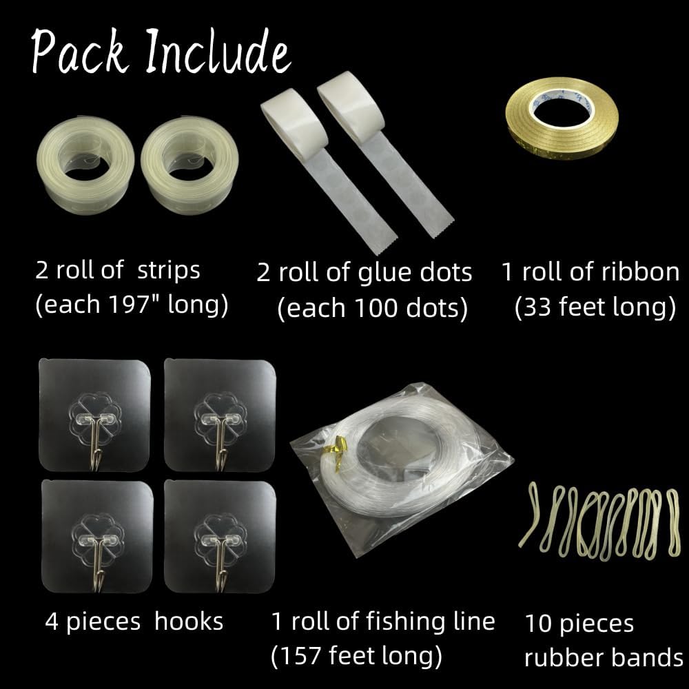 Balloon Arch Strip Kits for Garland, 32 Feet Balloon Tape Strips, 200 Glue Point Tape, 4 Adhensive Hooks with Balloon Ribbon and Rubber Bands for Party Decorations