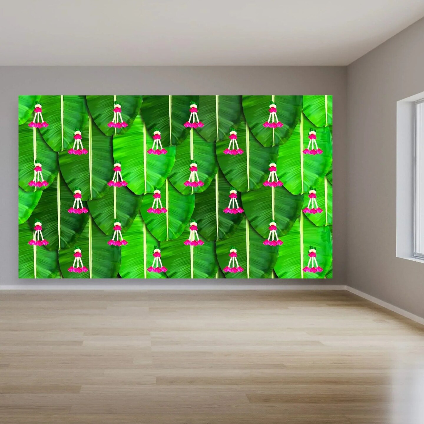 Banana Leaf Backdrop 5x8 Feet Backdrop Indian Traditional Cloth Backdrop Pooja Backdrop Indian Wall Art Photo Decor Banner Diwali Decor Wedding Backdrop Decorative Pooja Cloth