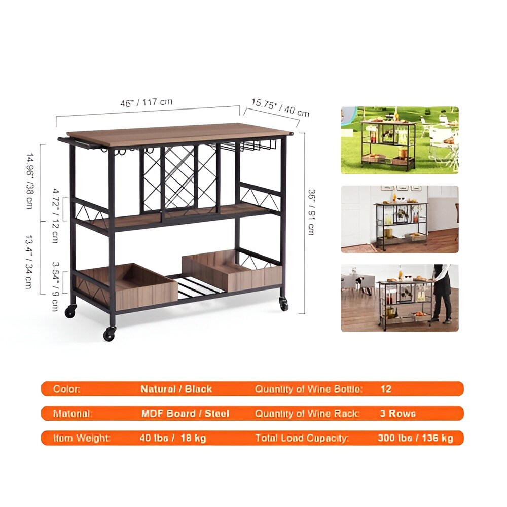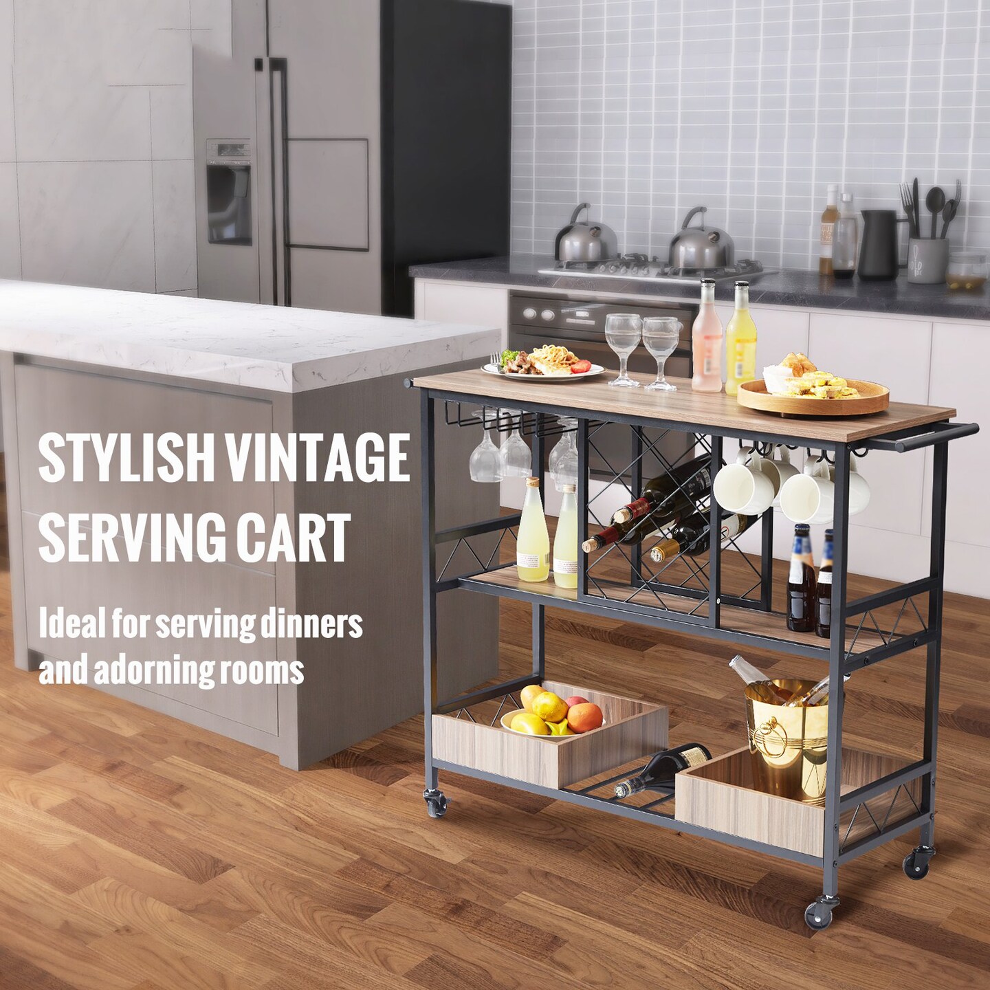 Bar Cart 3 Tier Rolling Beverage Cart with Lockable Wheels and Wine Rack