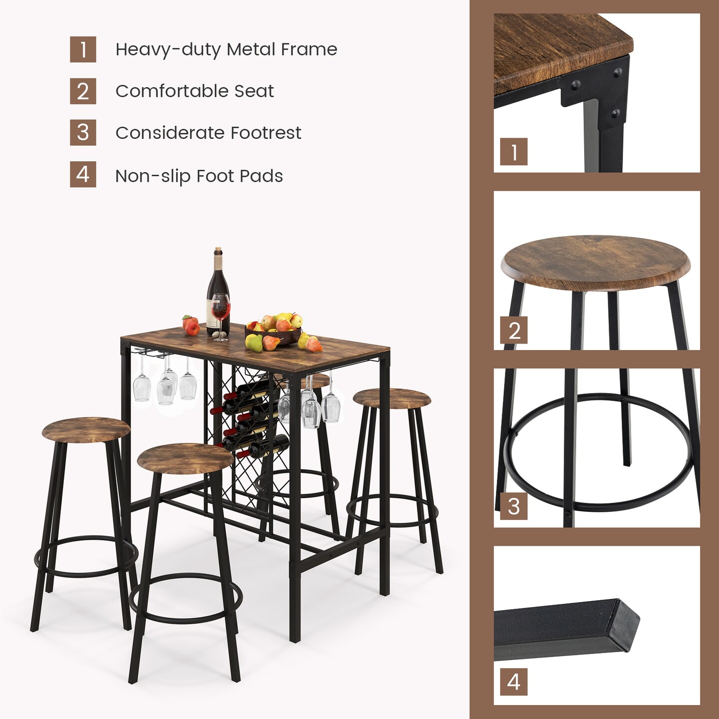 Bar Table Set 5-Piece with Stools, Wine Storage, and Glass Rack