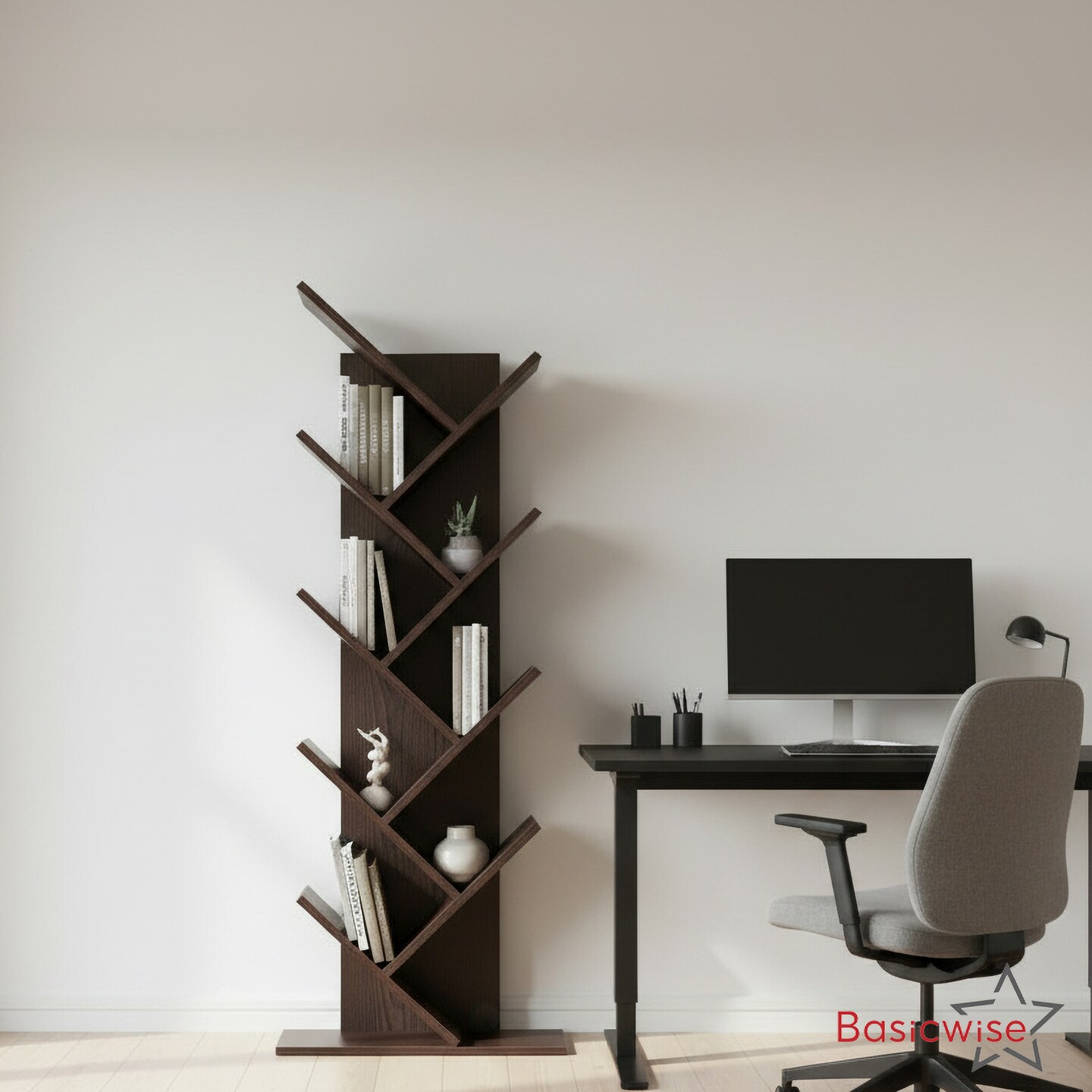 Basicwise Modern 9-Tier Wooden Tree Bookshelf for Home and Office Freestanding Vertical Book Storage Rack Zigzag Design Space-Saving Floor Standing Bookcase for Living Room Bedroom or Study, Brown